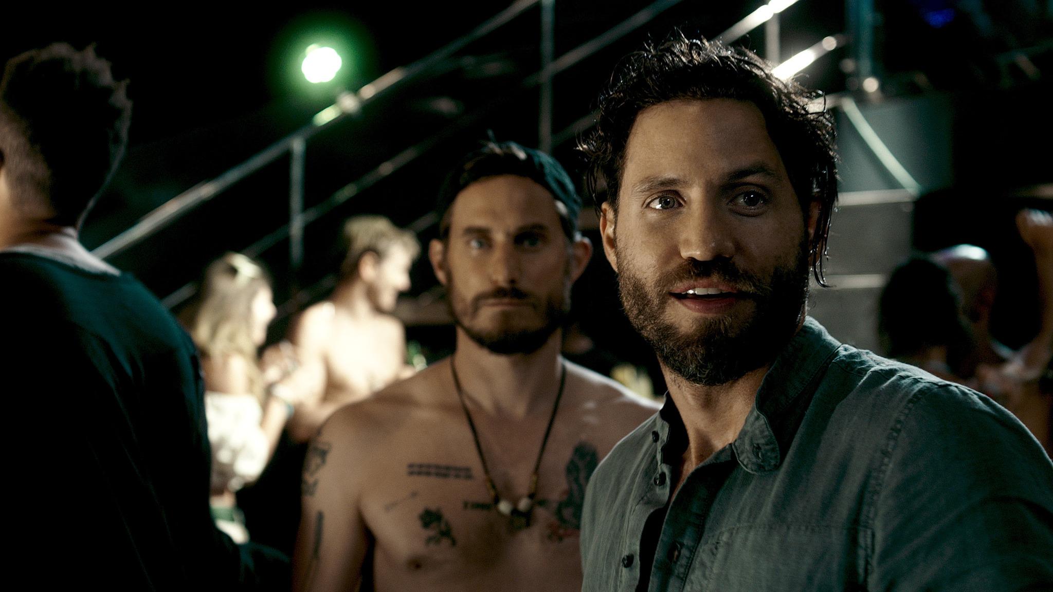 Description: A group of men standing next to each other in a room with a green light on the ceiling and a man with a beard.