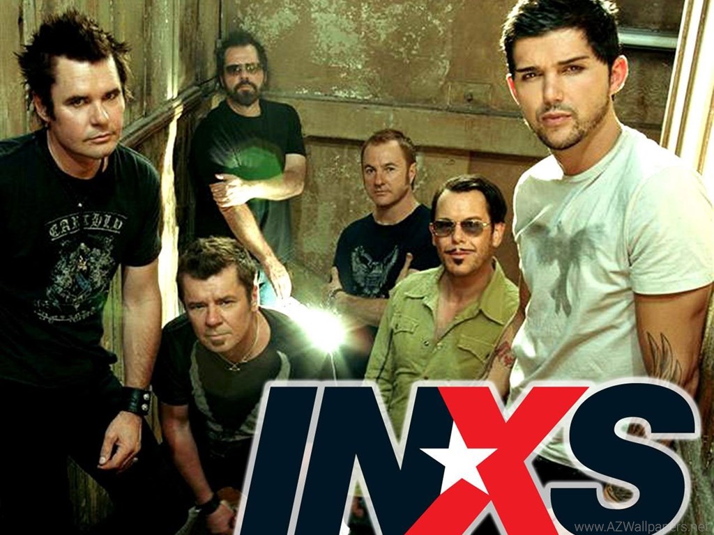 Description: A group of men standing next to each other in a room with a red and white sign that says inxs.