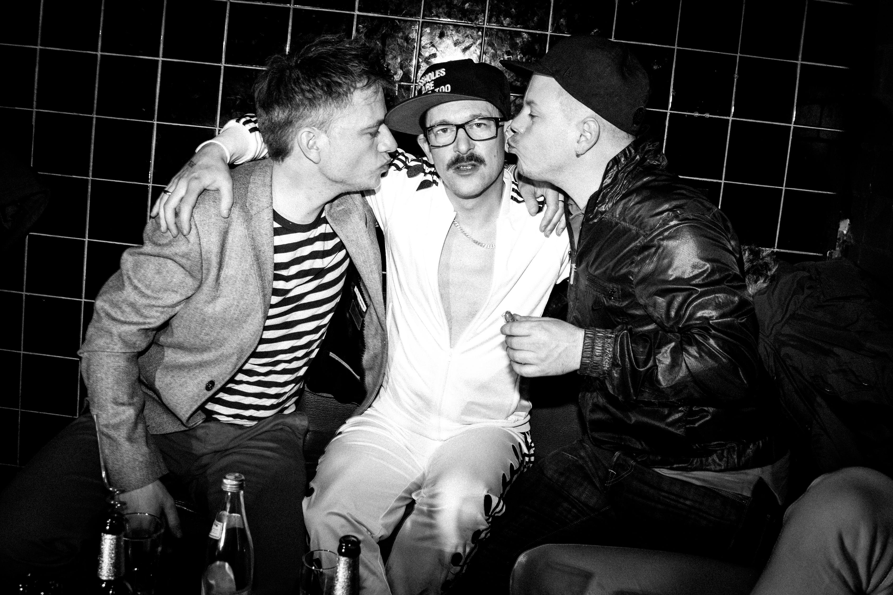 Description: A group of men sitting next to each other in a room with tiled walls and a wall of bottles.