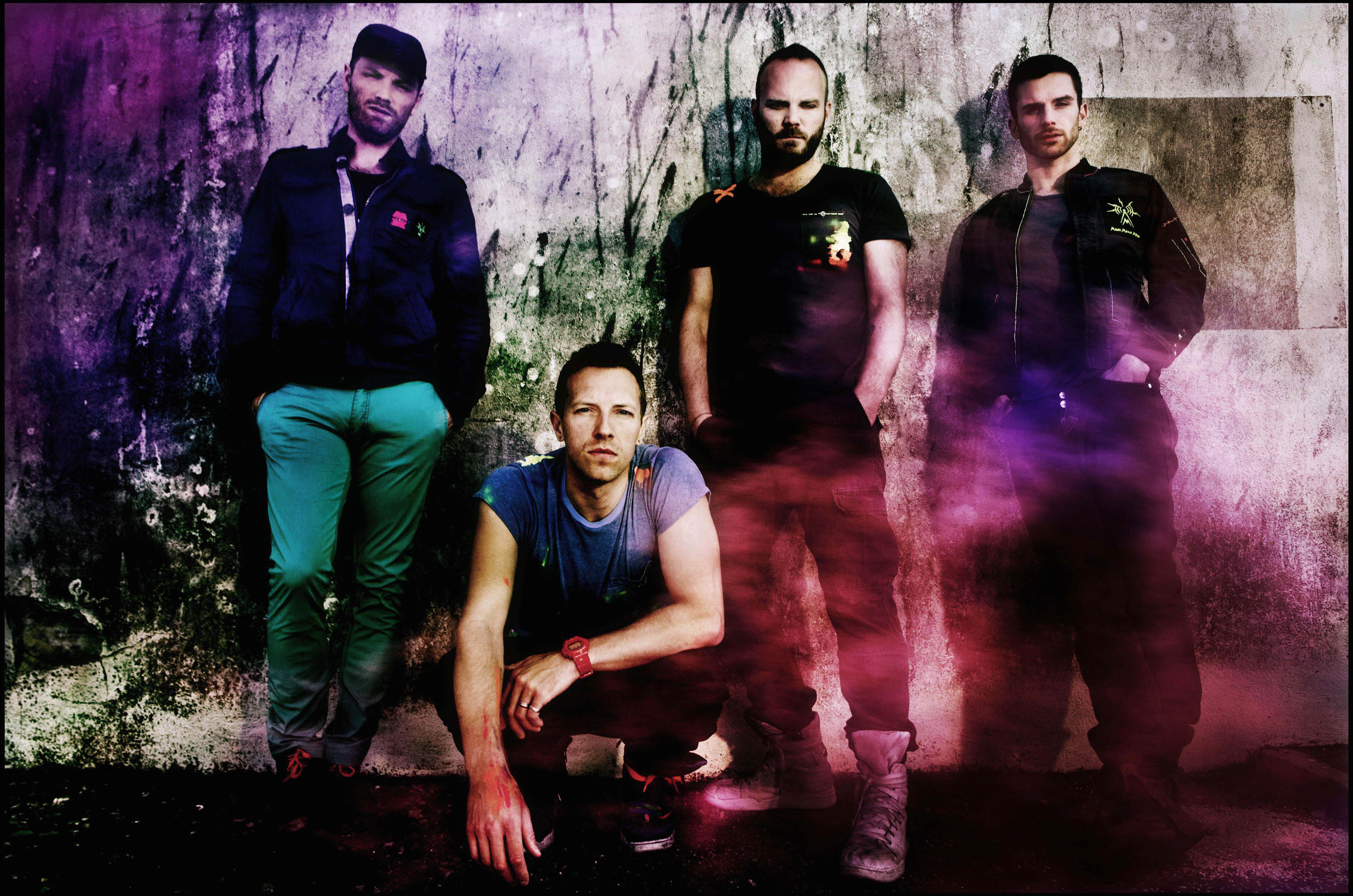 Description: A group of men standing next to each other in front of a wall with a purple light behind them.