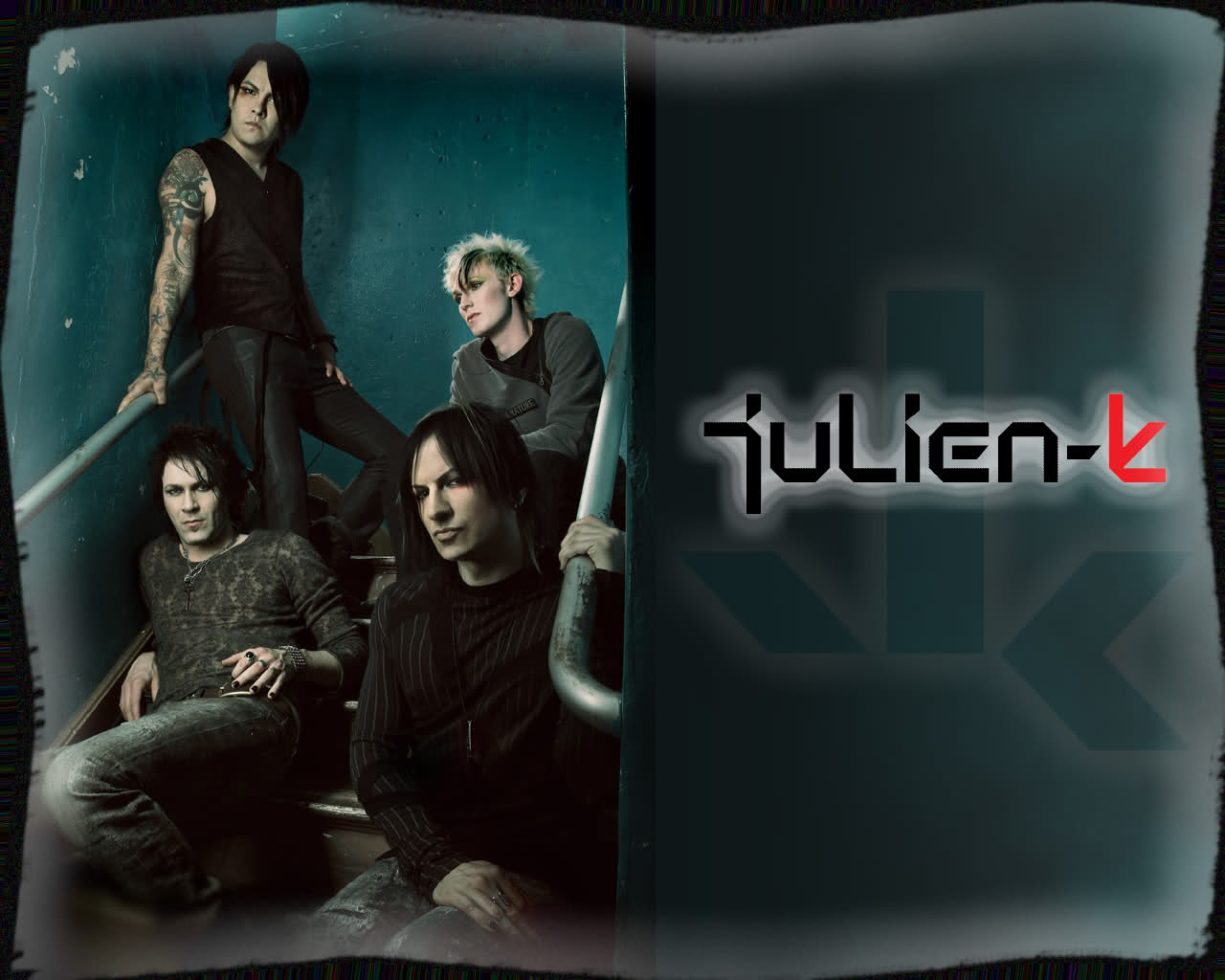 Description: A group of men sitting next to each other on a wall with the word julien k on it's side.