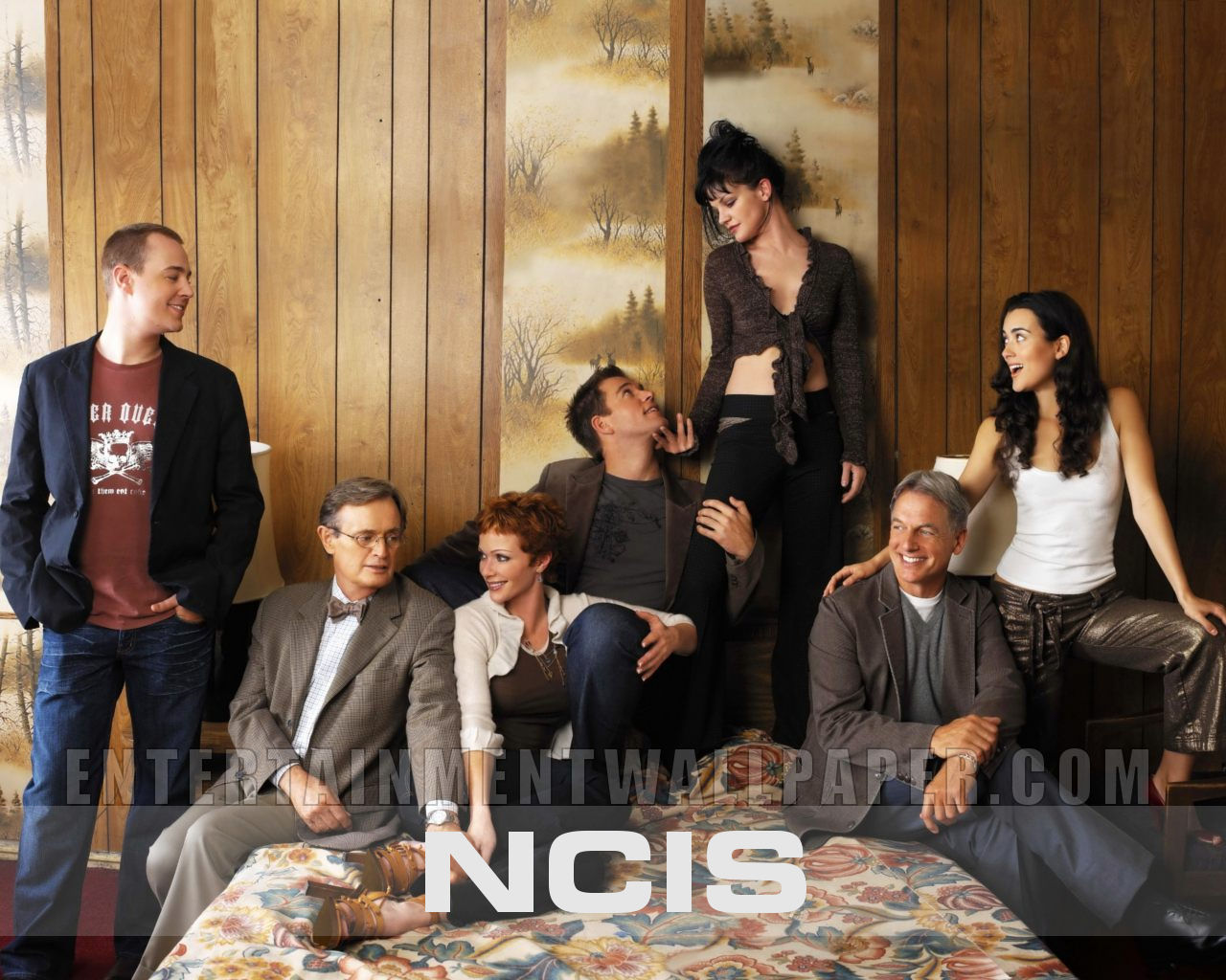 Description: A group of people standing and sitting around a bed in a room with wood paneling and a painting on the wall.