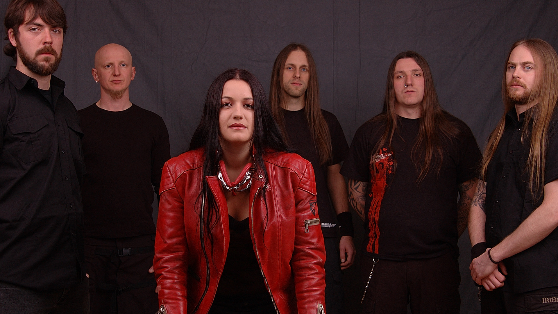 Description: A group of people standing next to each other in front of a black background with a woman in a red leather jacket.
