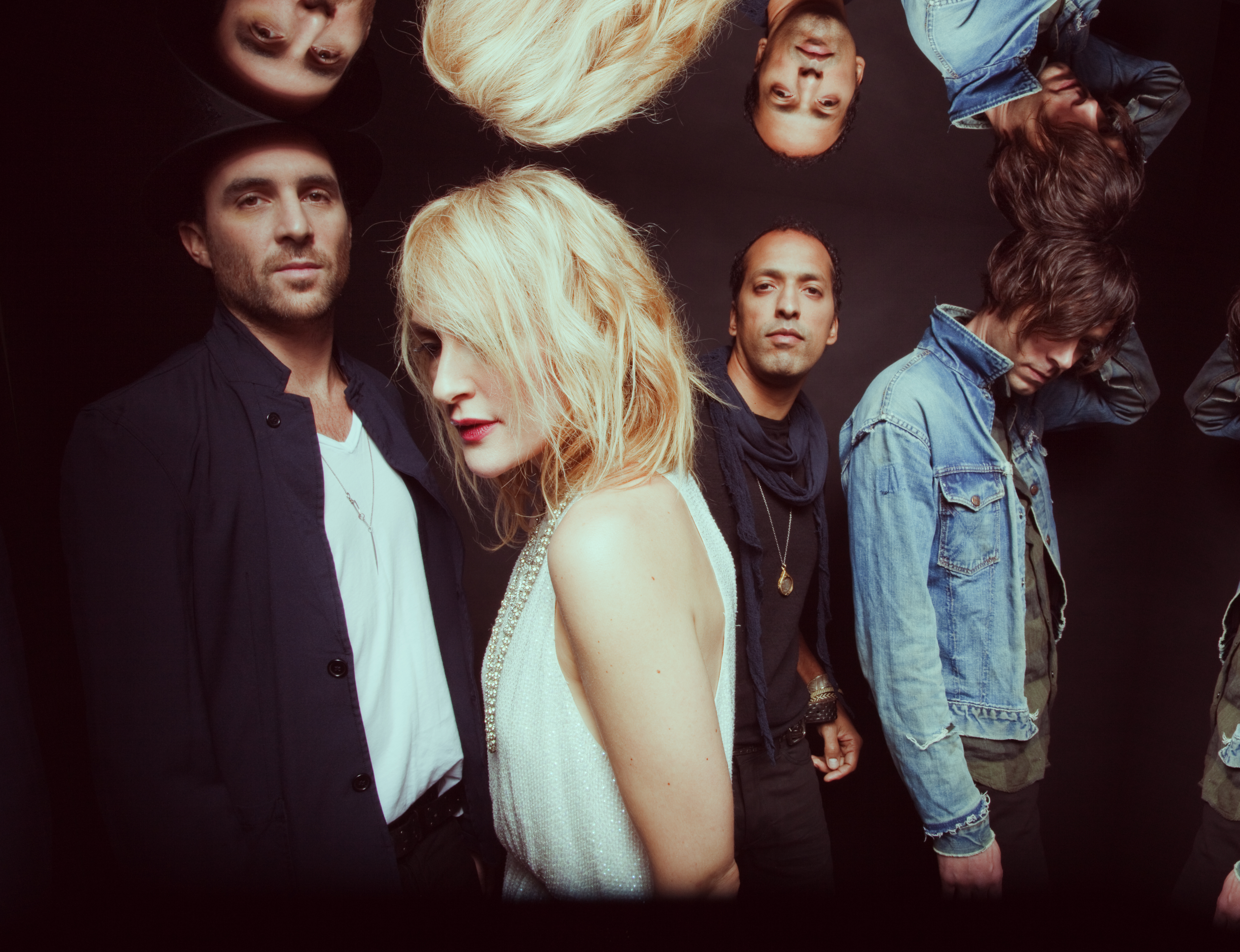 Description: A group of people standing in front of a black background with a woman in the middle of the group.
