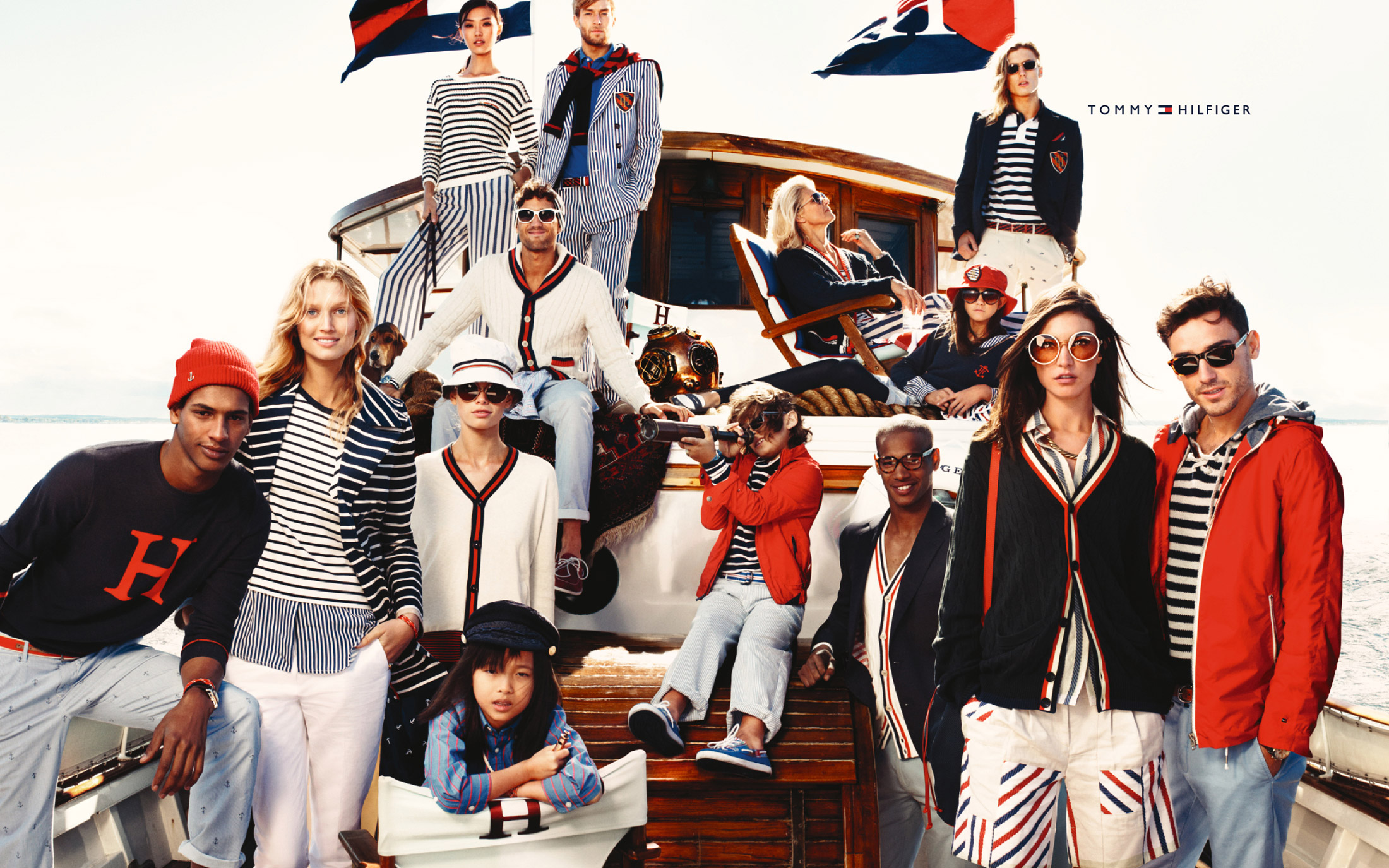 Description: A group of people on a boat posing for a picture together with flags flying in the background of the photo.