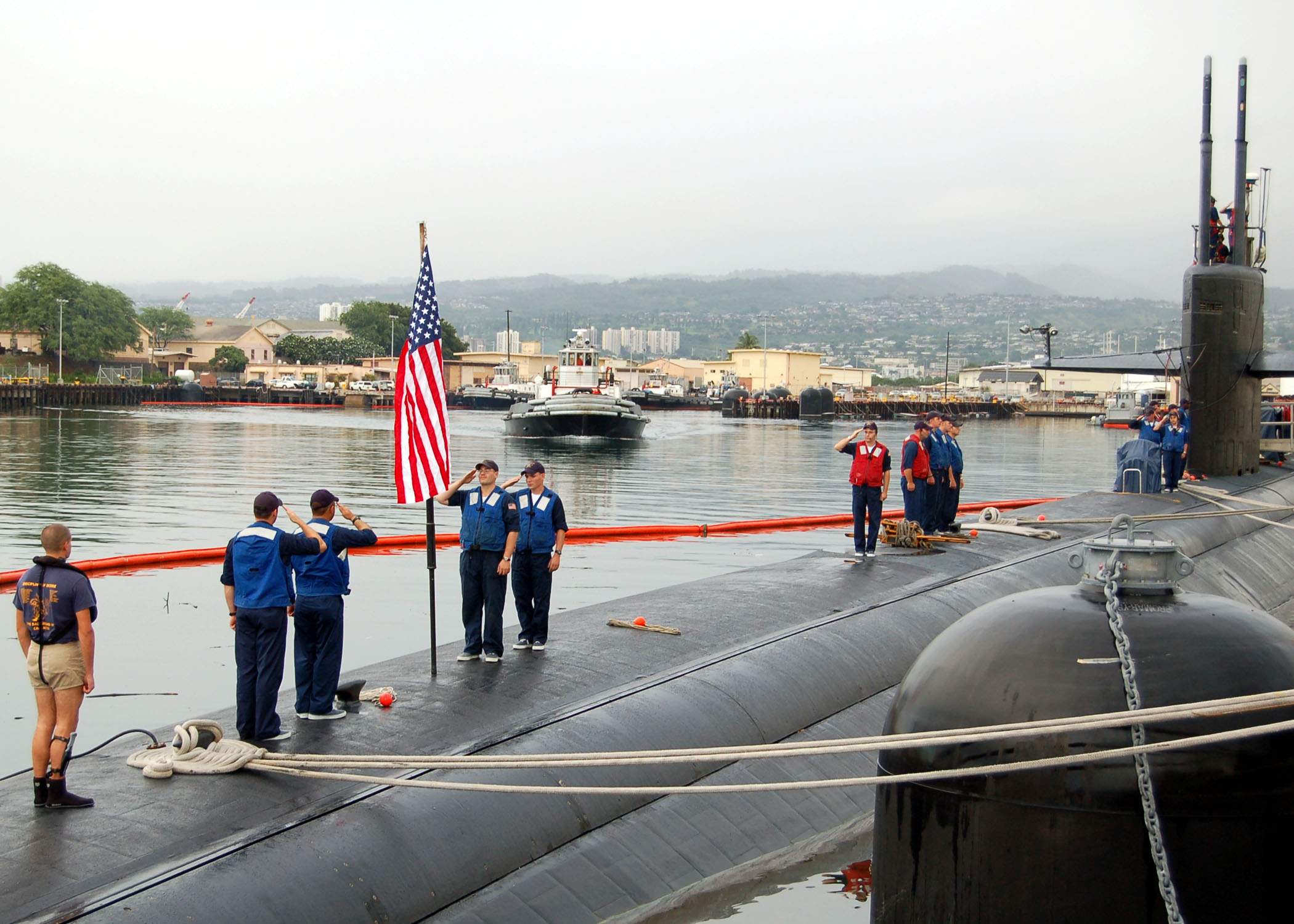 Description: A group of people standing on top of a boat in the water next to a flag pole and a flag.
