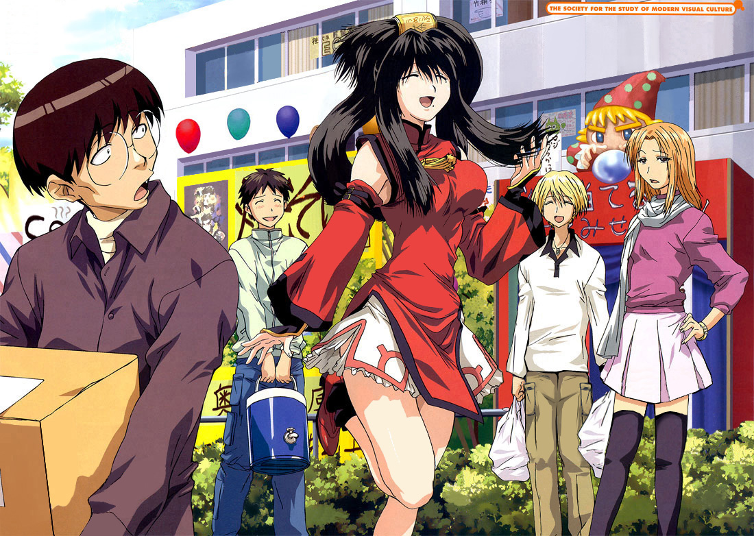 Description: A group of people standing around a box in front of a building with balloons on it and a man holding a box.