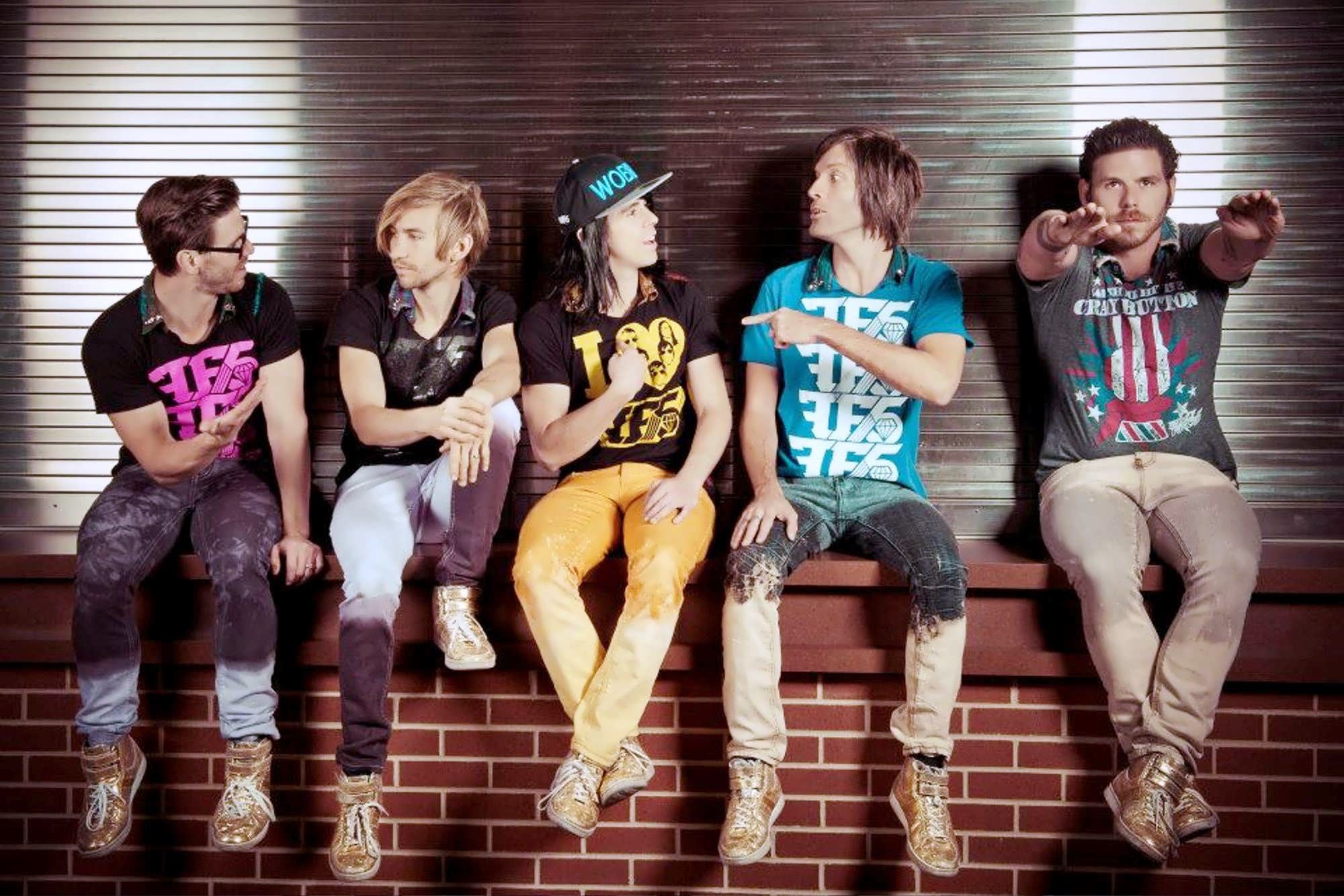 Description: A group of people sitting on a brick wall next to each other on a bench with their hands in the air.
