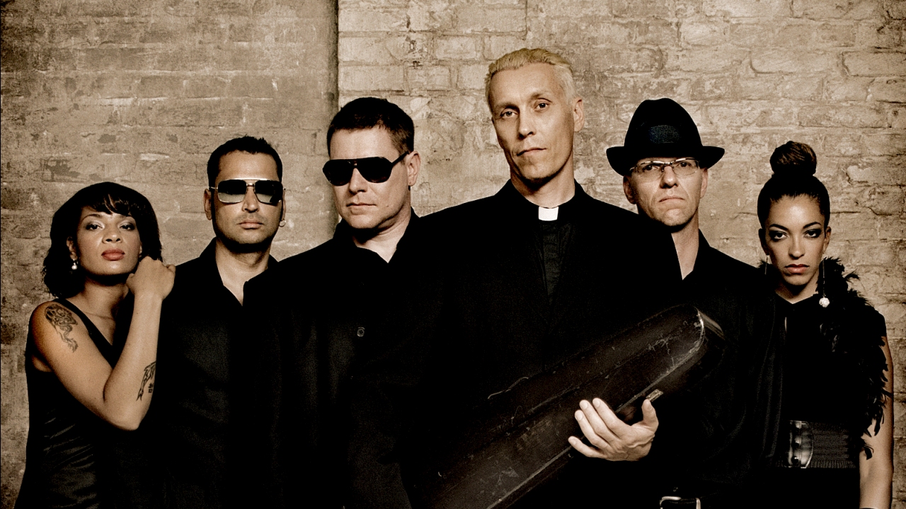 Description: A group of people standing next to each other in front of a brick wall with a large bag on it.