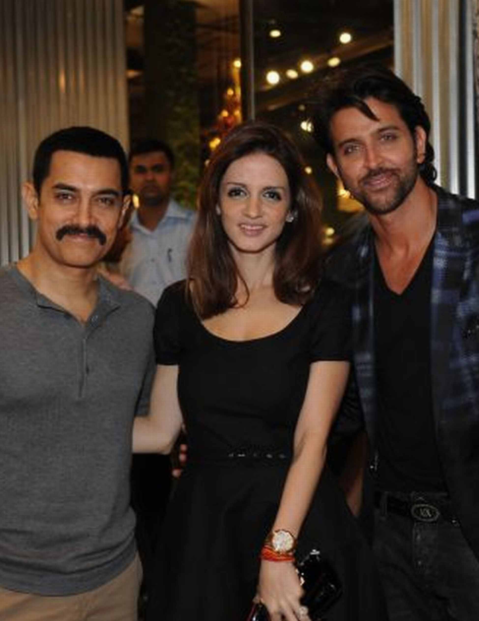Description: A group of people standing next to each other near a building with a man in a mustache and a woman in a black dress.