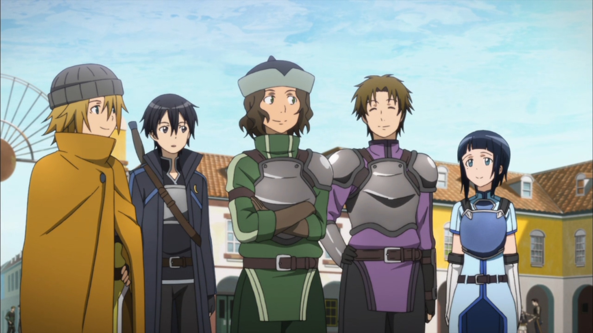 Description: A group of people standing next to each other in front of a building with a windmill in the background.