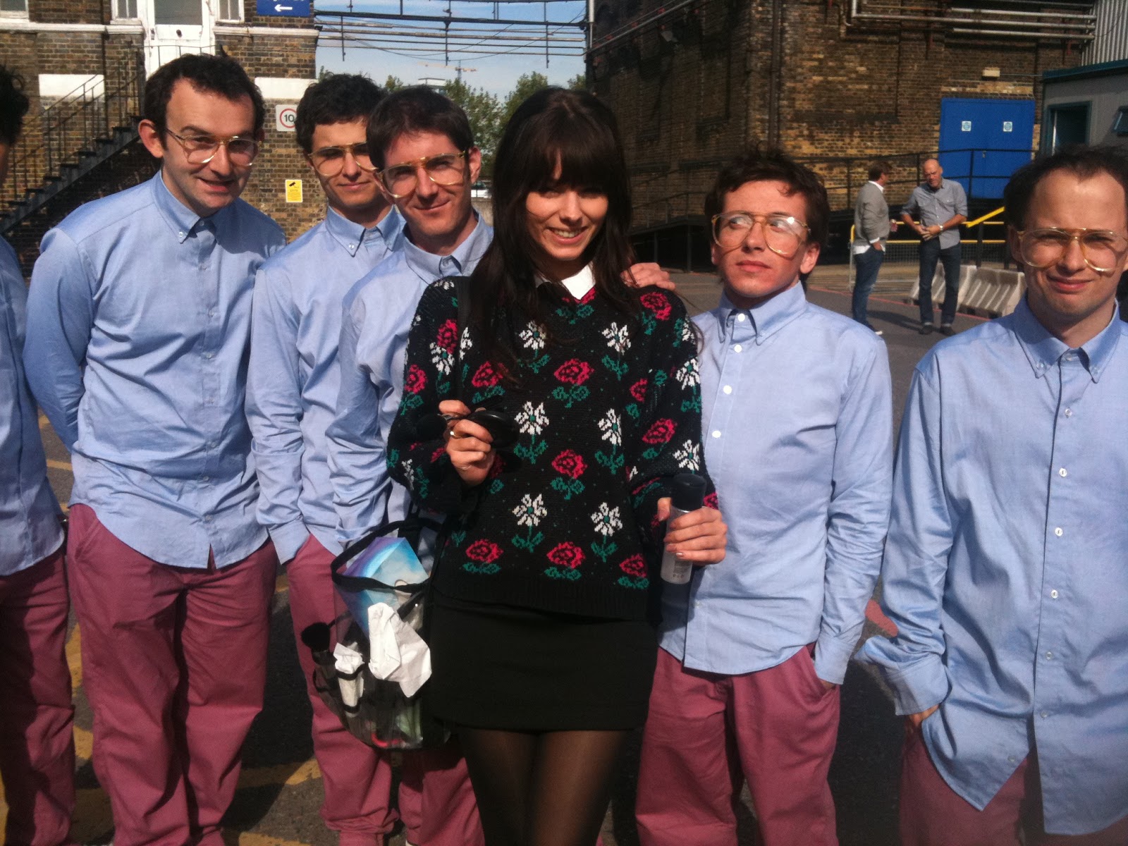 Description: A group of people standing next to each other in front of a building with a woman in a black dress.