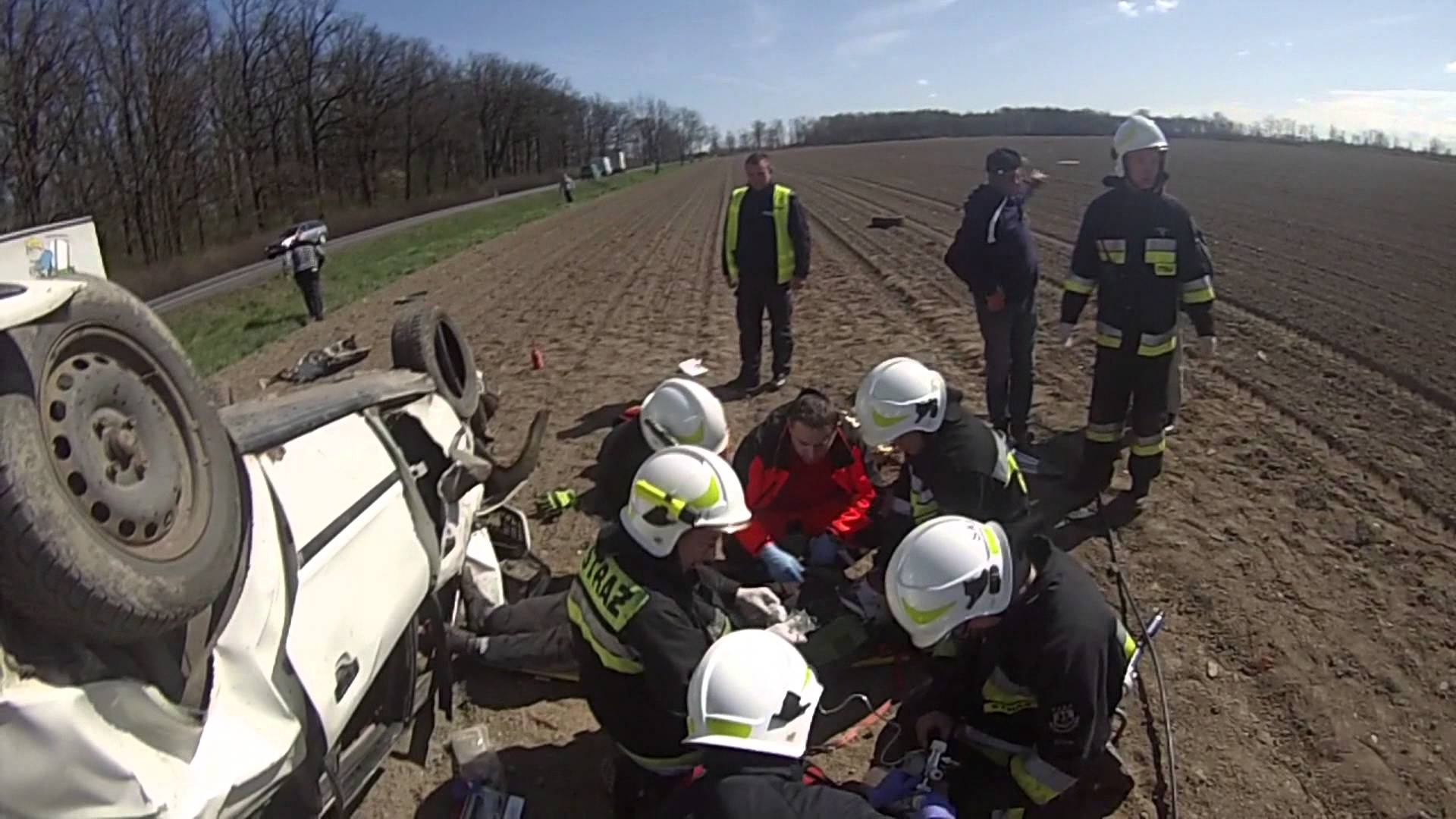 Description: A group of people standing around a car that is on the side of a road with a person in the middle of the road.