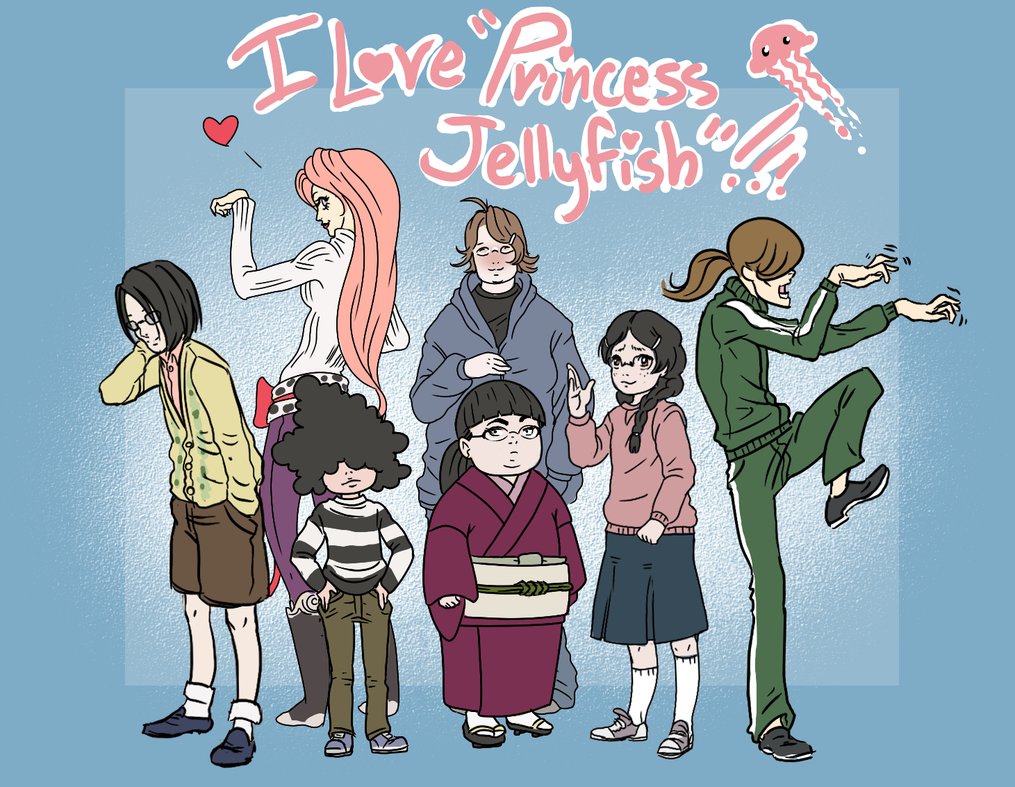 Description: A group of people standing next to each other with a cartoon character on the back of them.