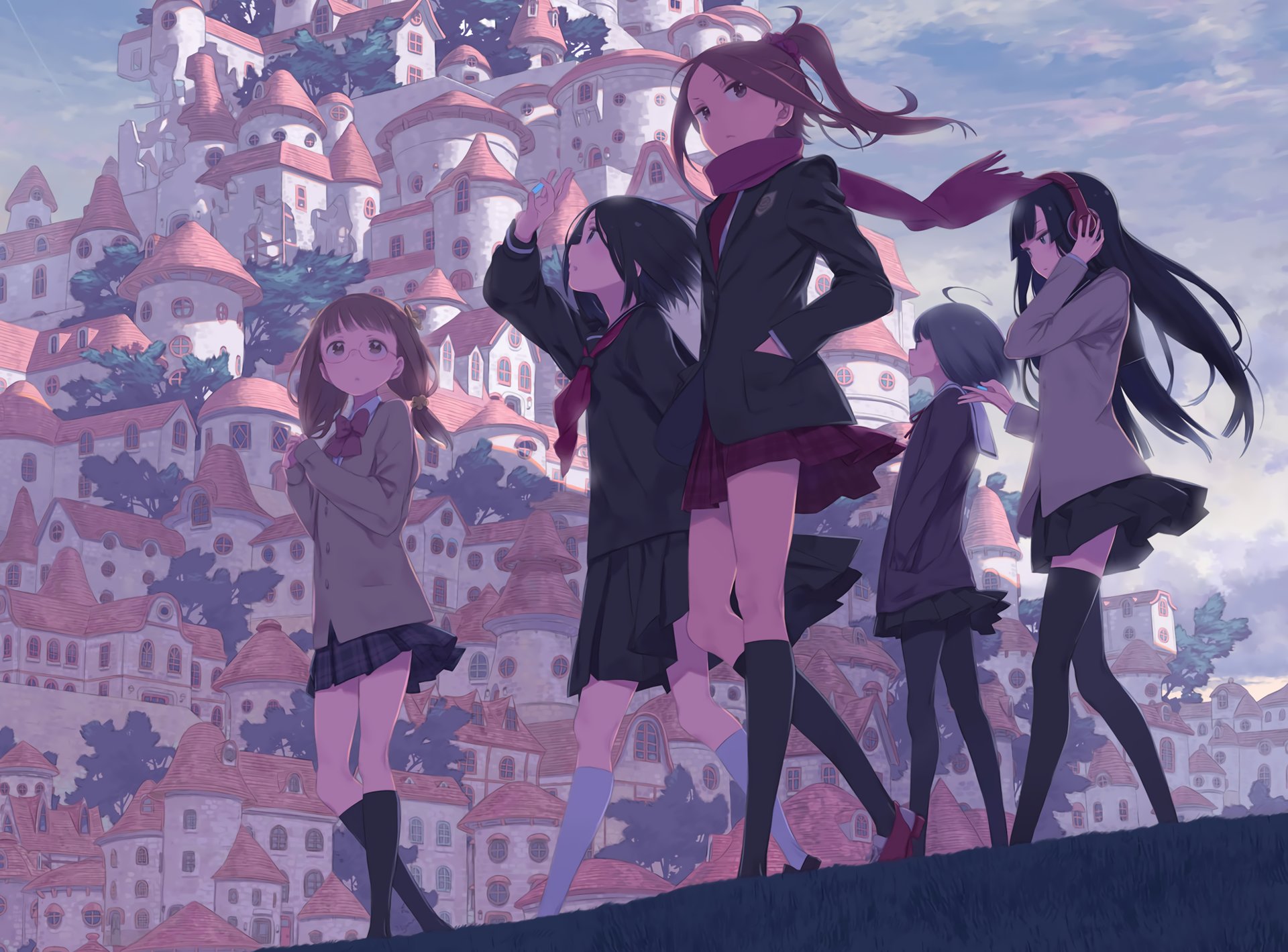 Description: A group of people standing in front of a castle with a sky background and a sky background with buildings.
