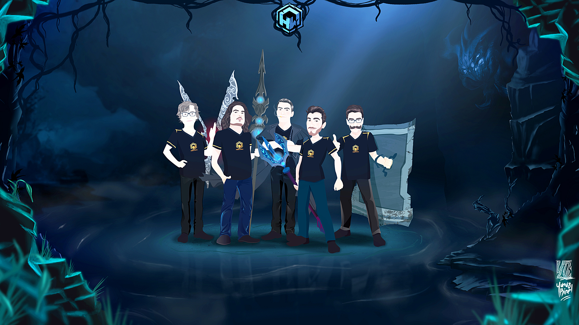 Description: A group of people standing in front of a cave with a light shining on them and a tree in the background.