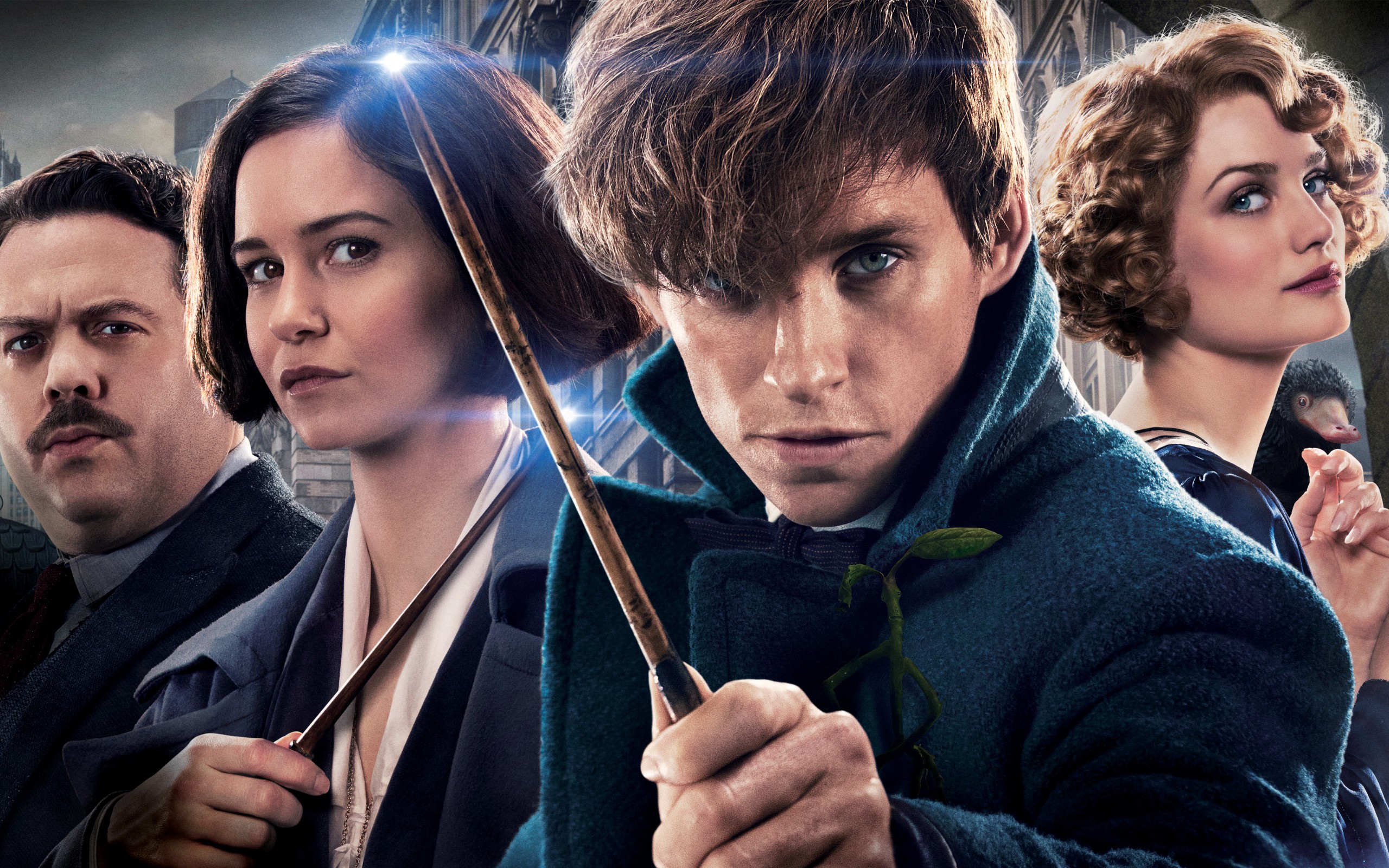 Description: A group of people standing next to each other in front of a city skyline with a harry potter sign.