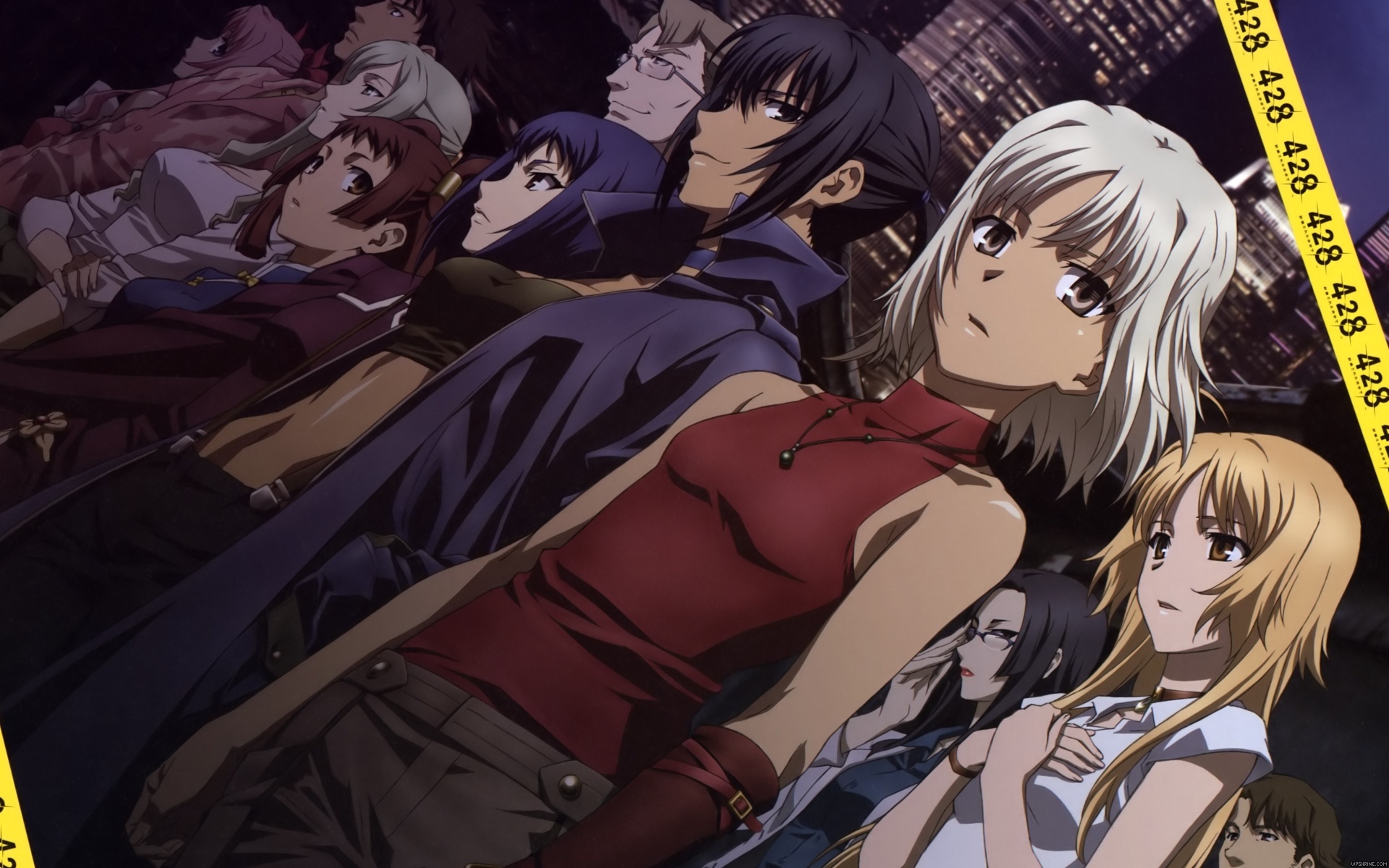 Description: A group of people standing next to each other in front of a city skyline with a yellow tape around them.