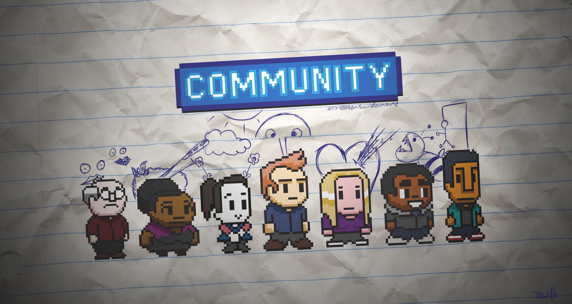 Description: A group of people standing in front of a sign that says community on it with a blue marker above them.