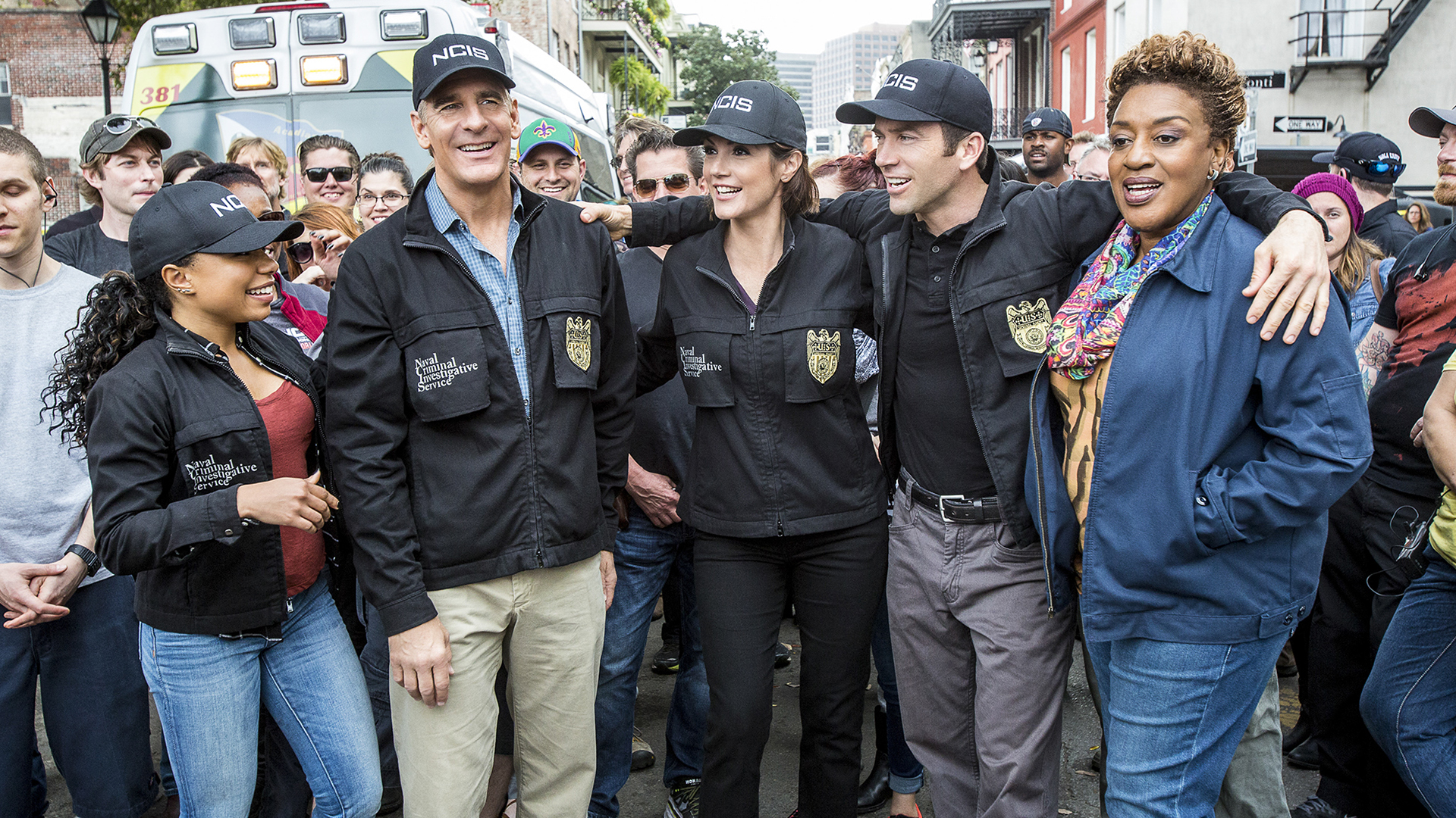 Description: A group of people standing next to each other in front of a crowd of people on a street corner.