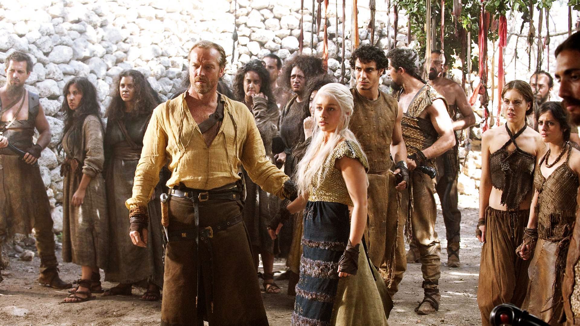 Description: A group of people standing around each other in a desert area with a stone wall behind them and a man in a yellow shirt.