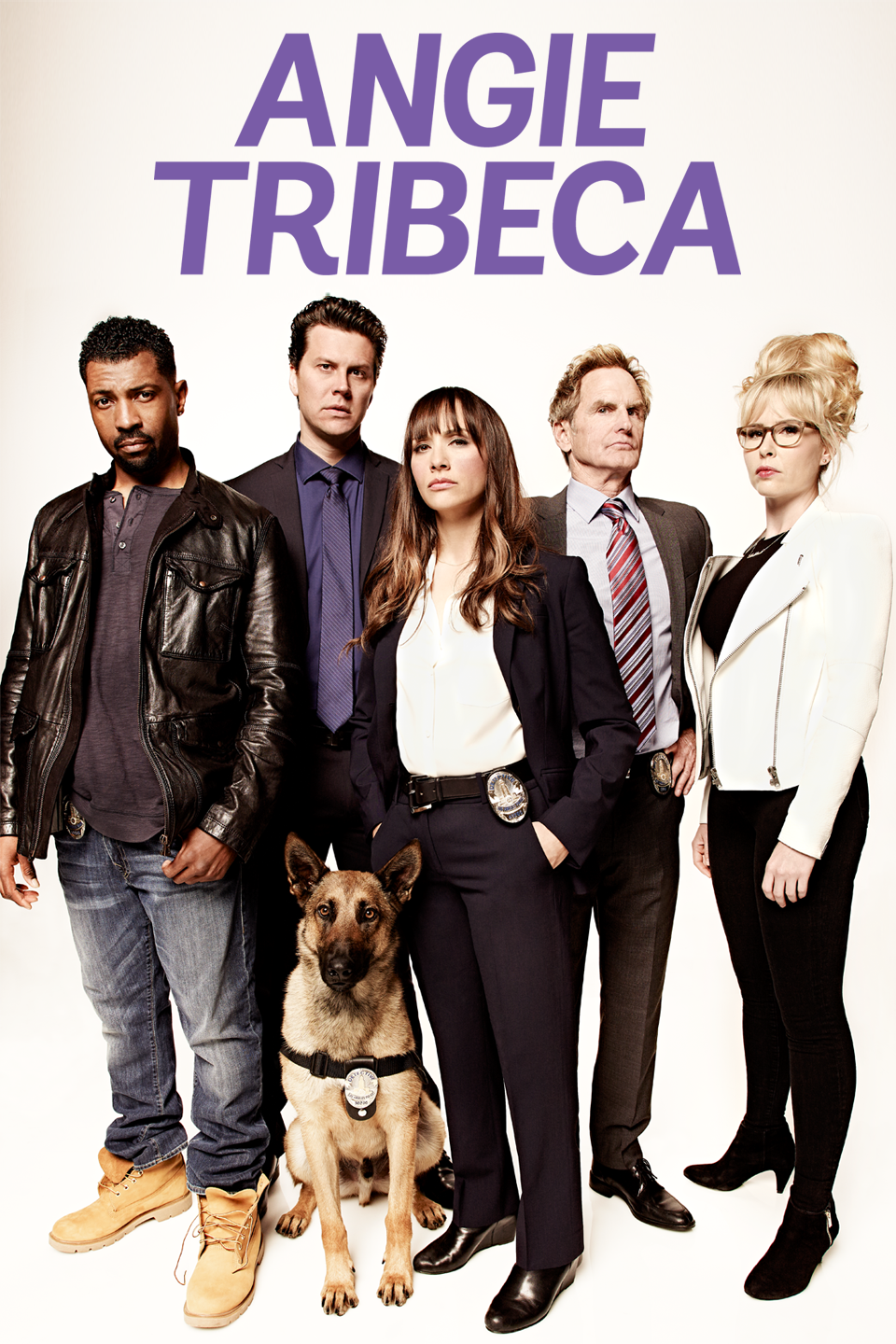 Description: A group of people standing next to a dog on a white background with a purple and blue sign behind them.