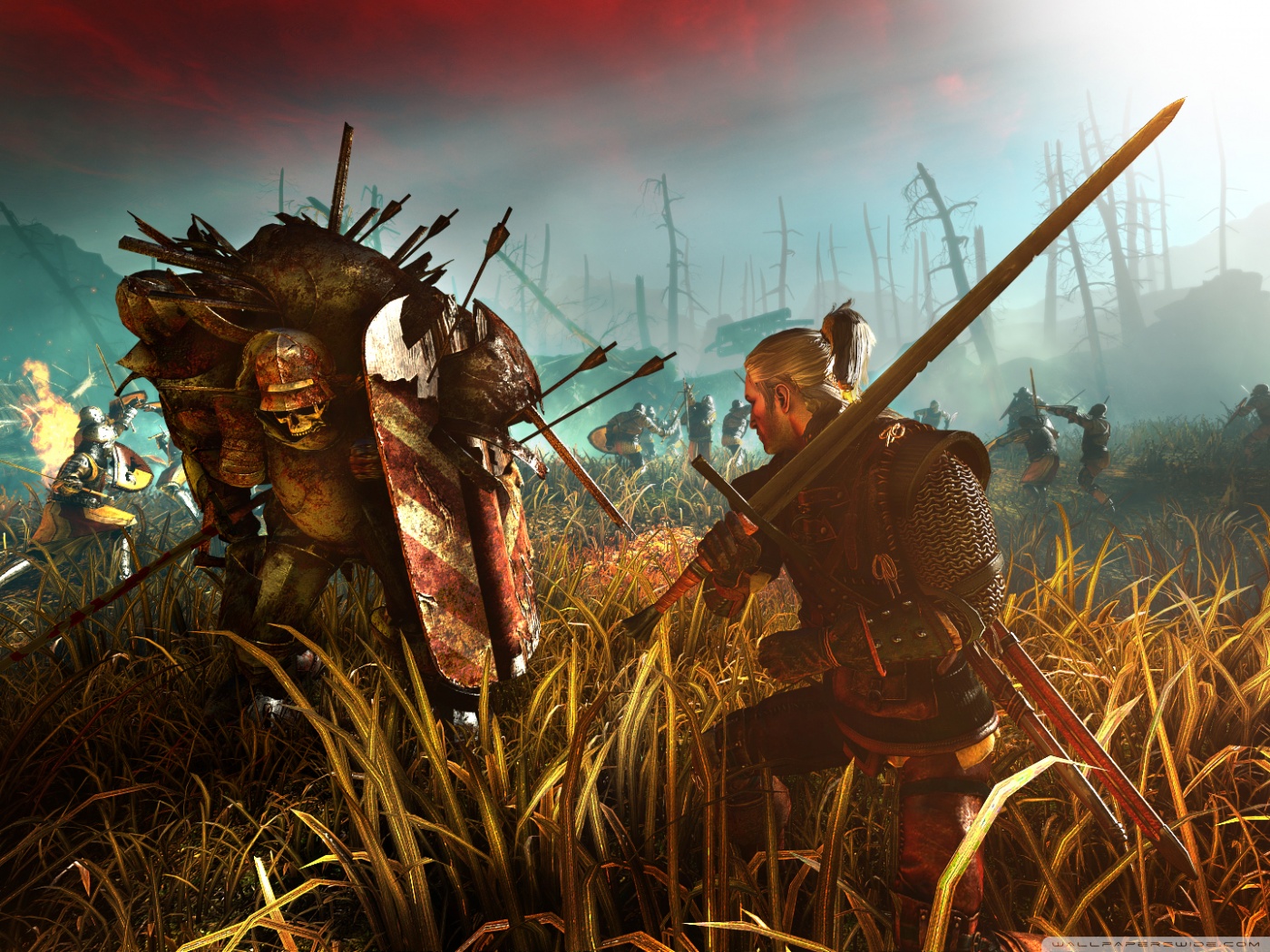 Description: A group of people in a field with swords and armor on a cloudy day with a red sky behind them.