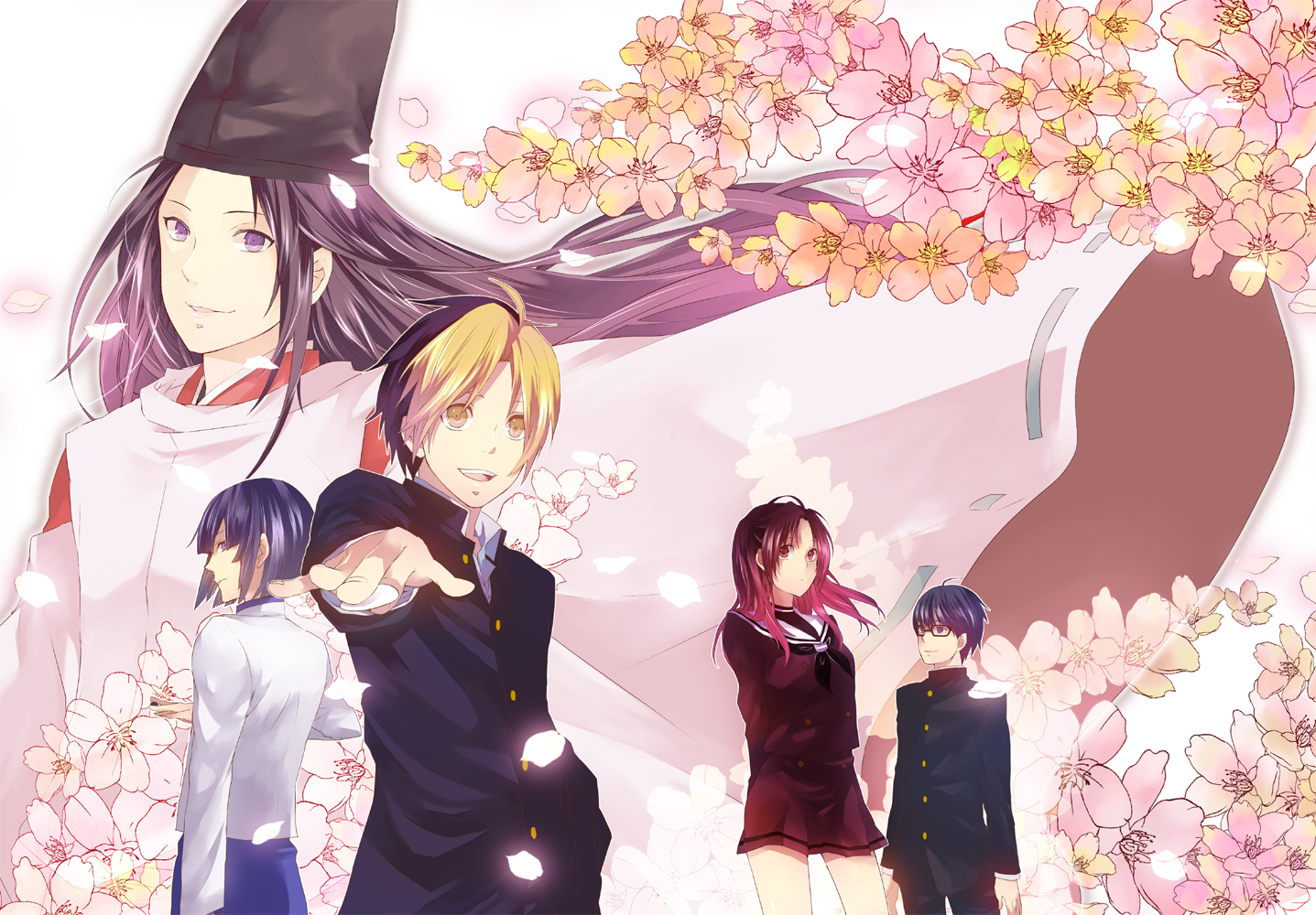 Description: A group of people standing next to each other in front of flowers and a tree with pink flowers on it.