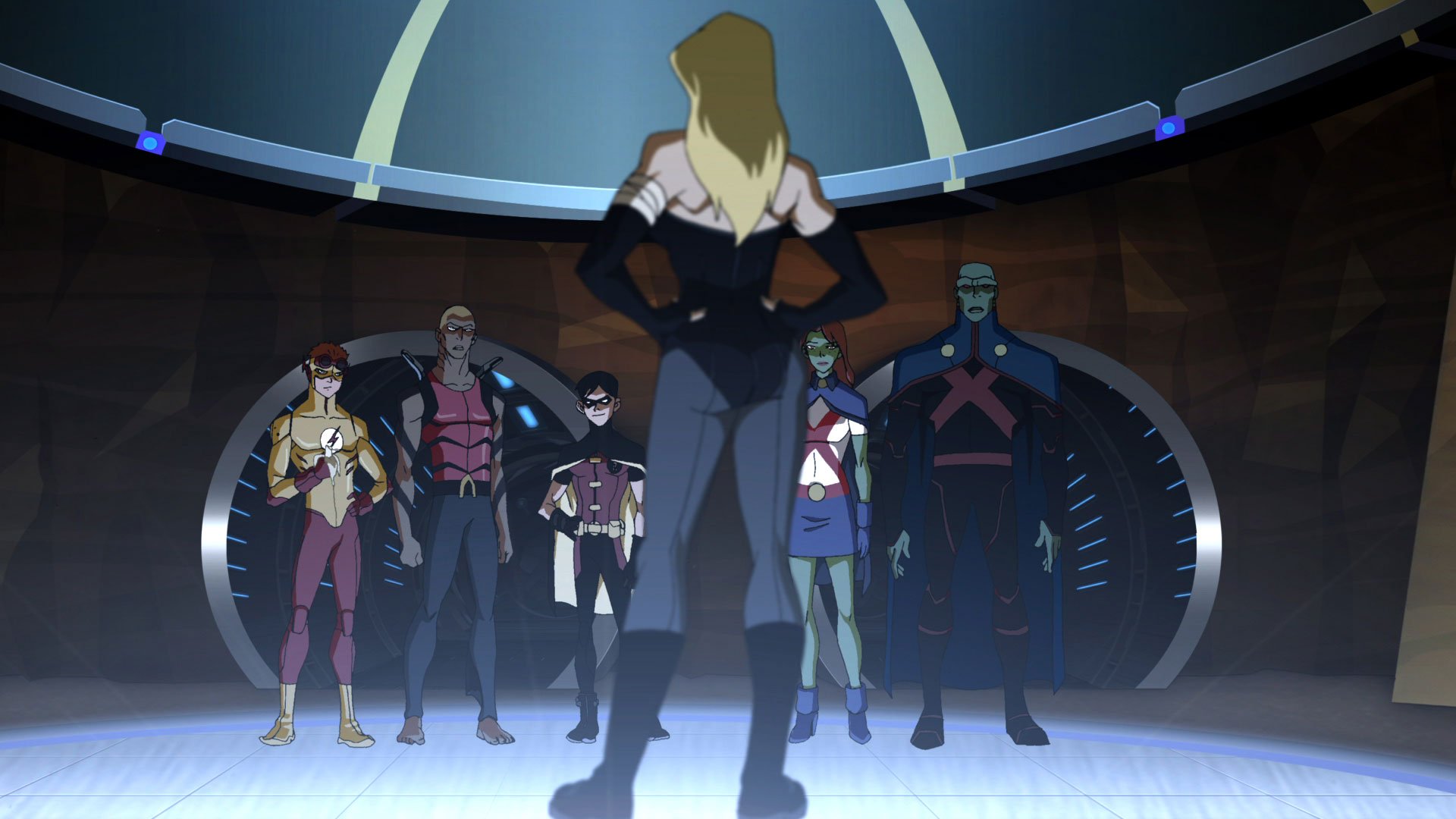 Description: A group of people standing in front of a giant screen with a woman standing in front of them and a man standing behind them.