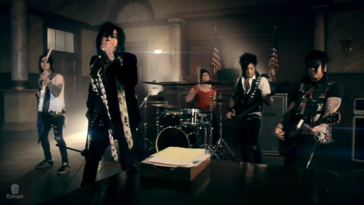 Description: A group of people standing around a table with guitars and drums in front of them and a microphone in the background.