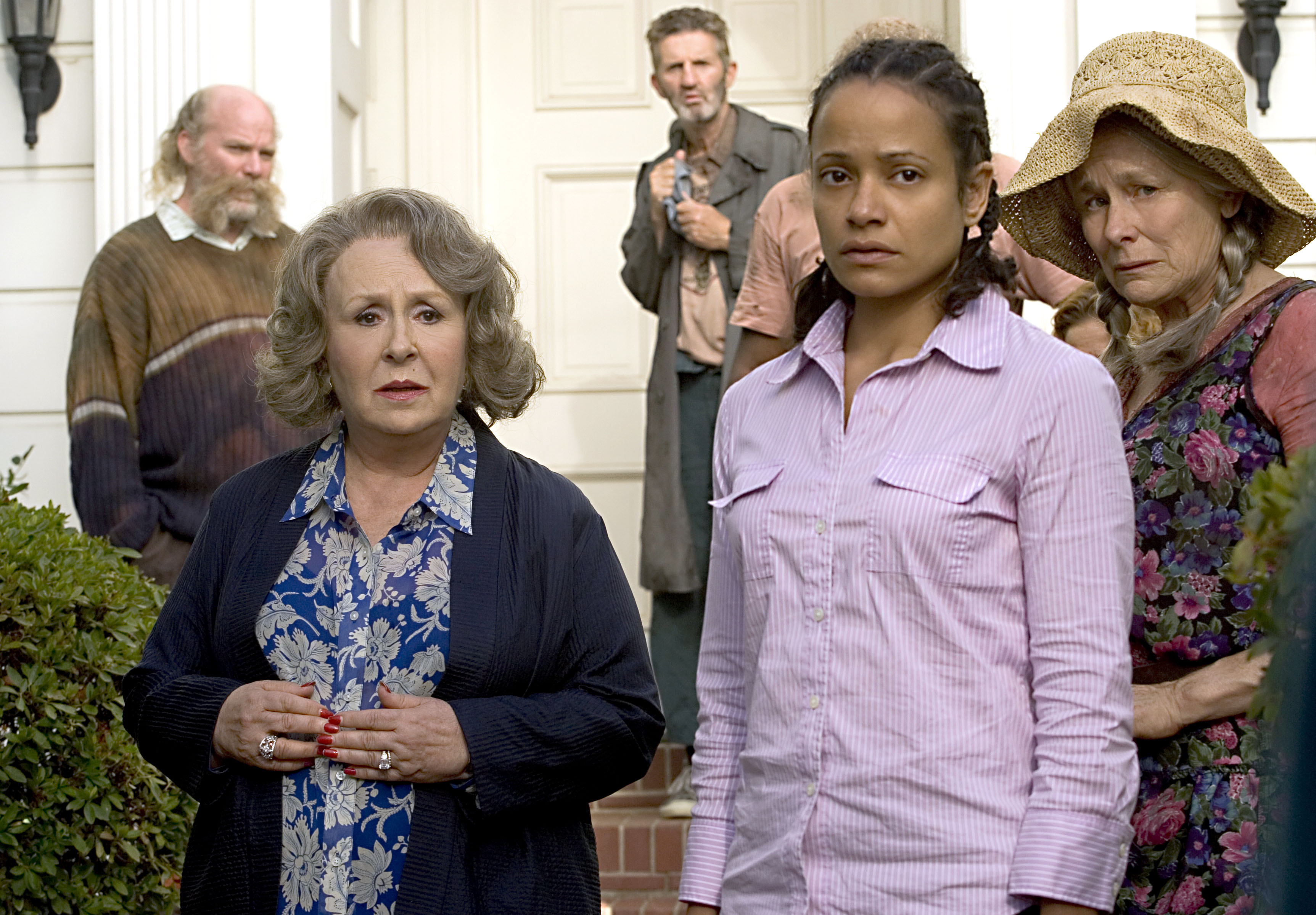 Description: A group of people standing in front of a house with a man standing behind them and a woman standing behind them.