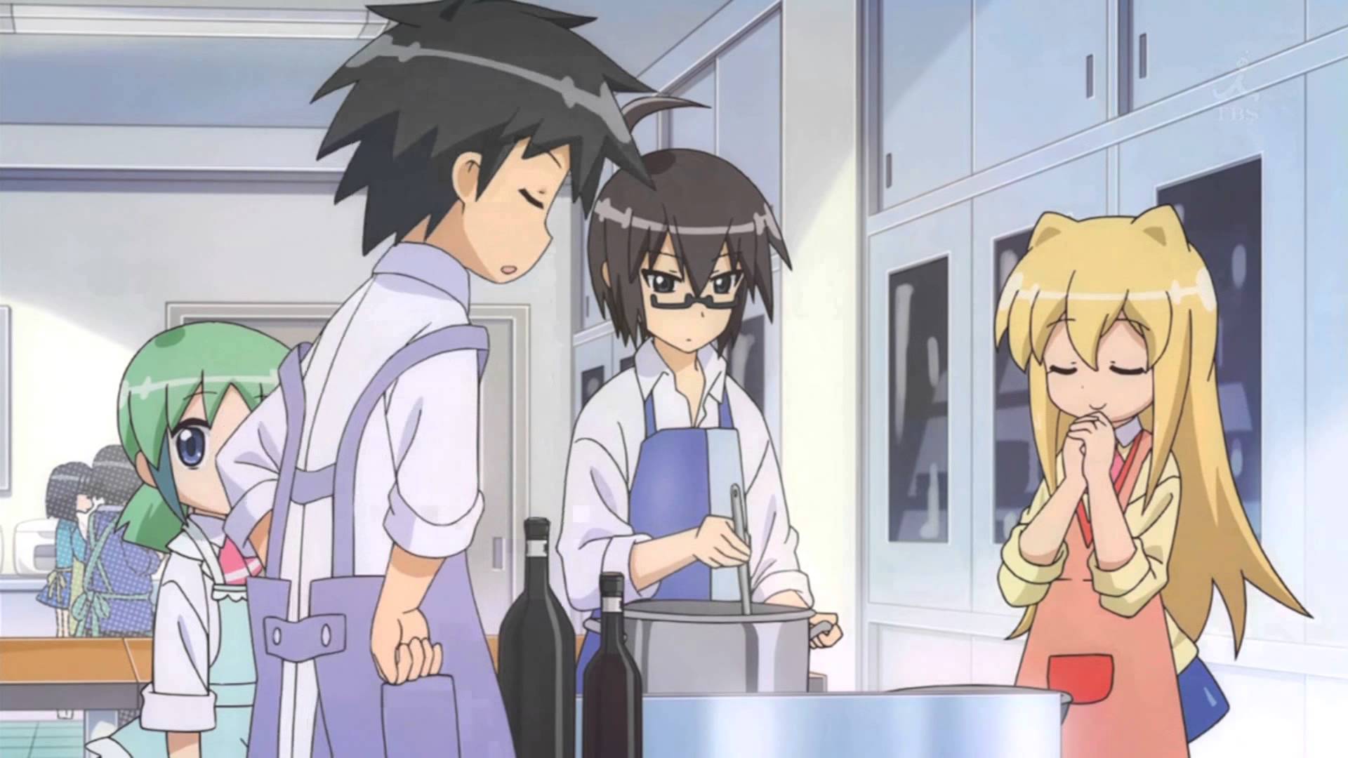 Description: A group of people standing around a counter in a kitchen with a bottle of wine in the background and a woman holding a glass.