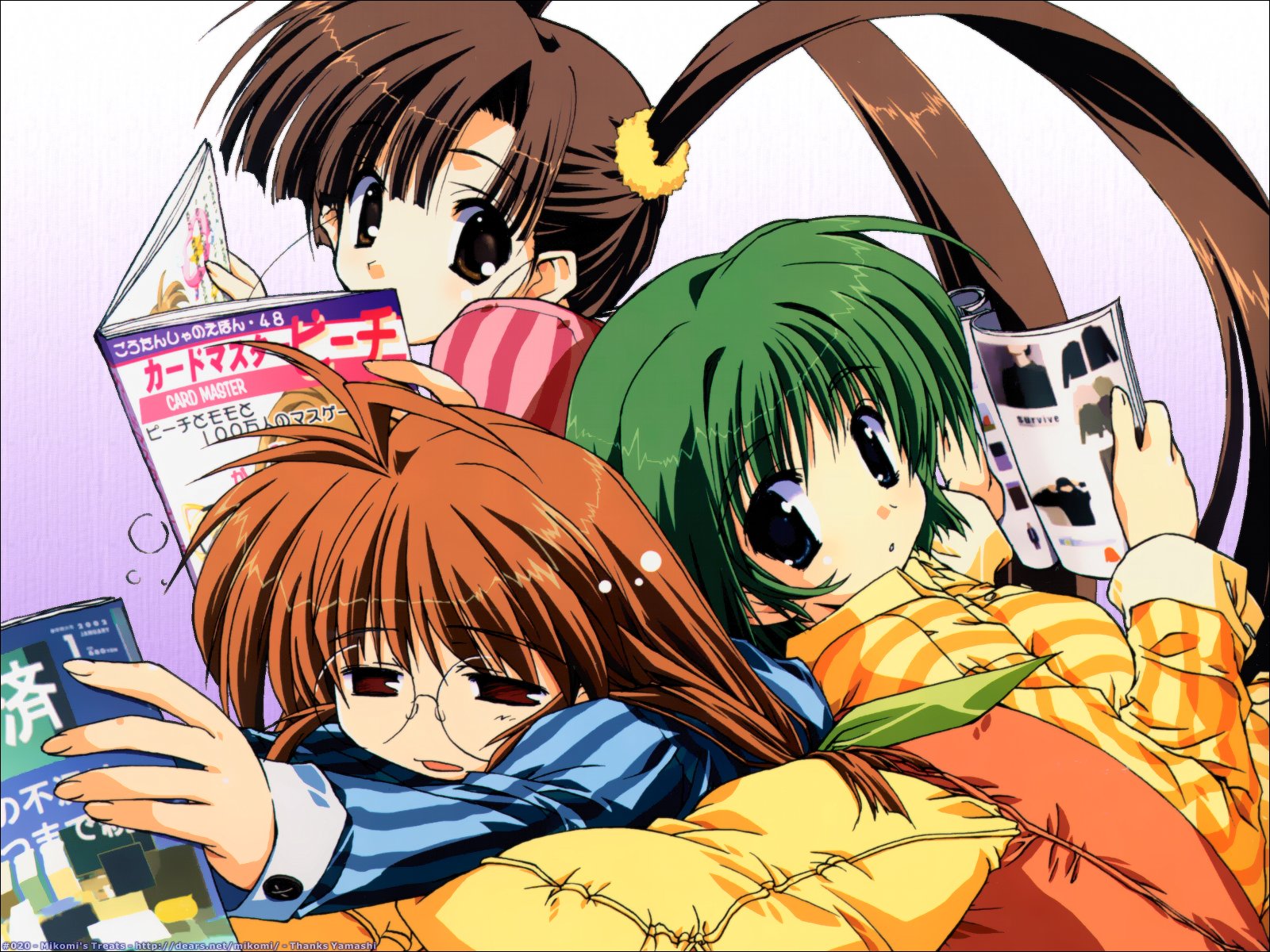 Description: A group of people laying on top of each other with a cell phone in their hand and a magazine in their hand.