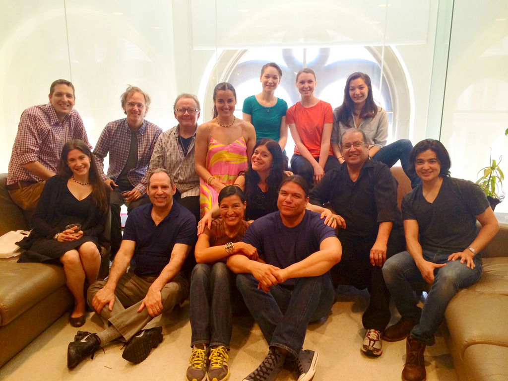 Description: A group of people posing for a picture together in a room with a circular window and a couch in front of them.