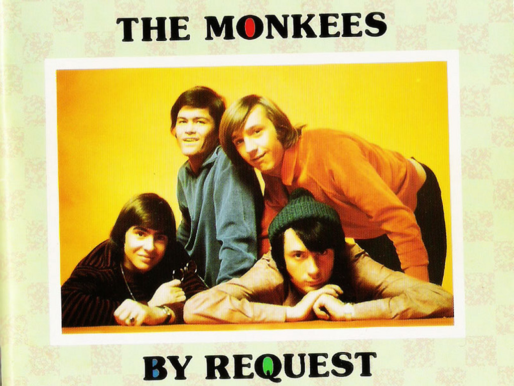 Description: A group of people posing for a picture together in front of a yellow background with the words the monkees.