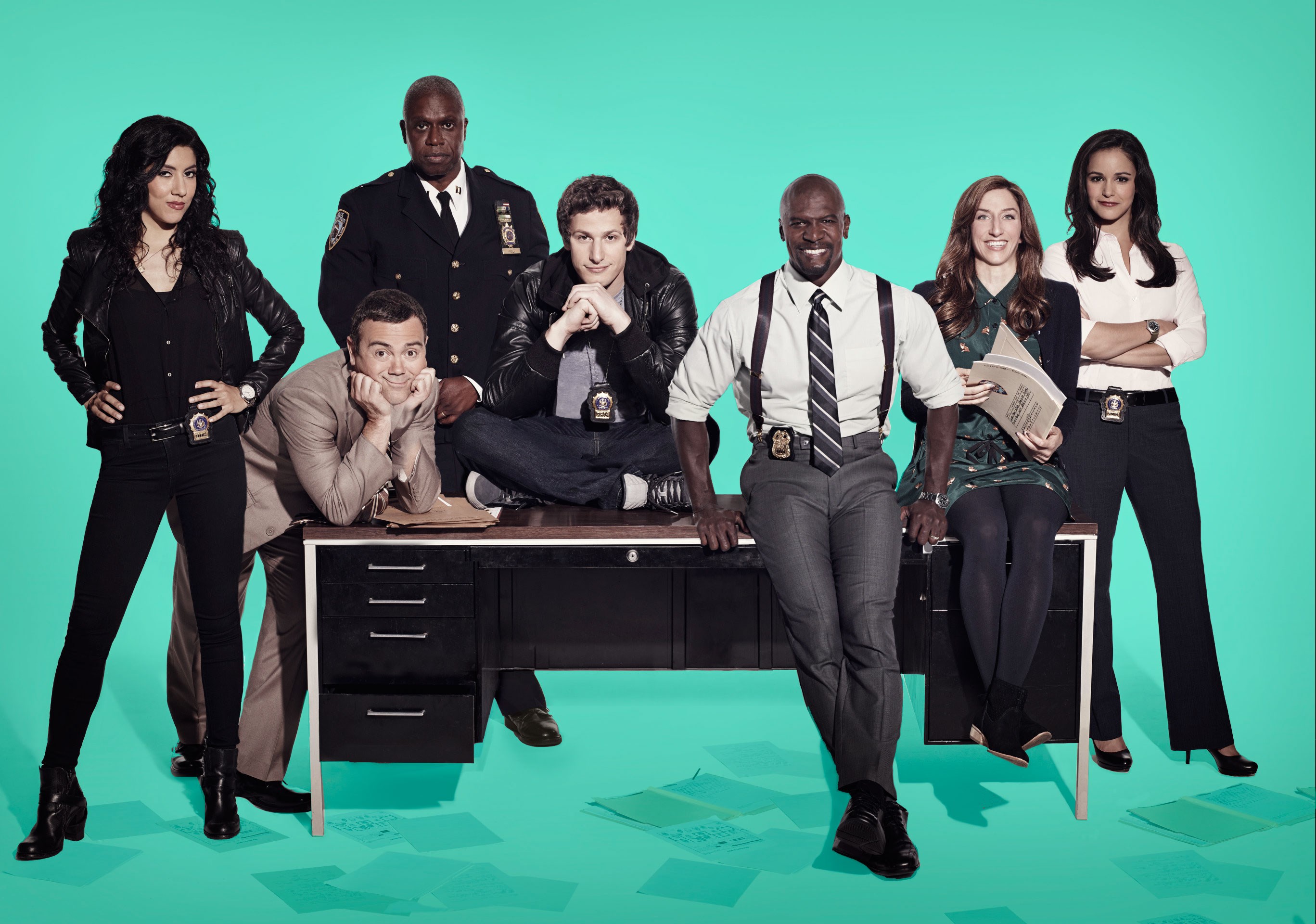 Description: A group of people posing for a picture on a desk with a green background and a blue backdrop behind them.