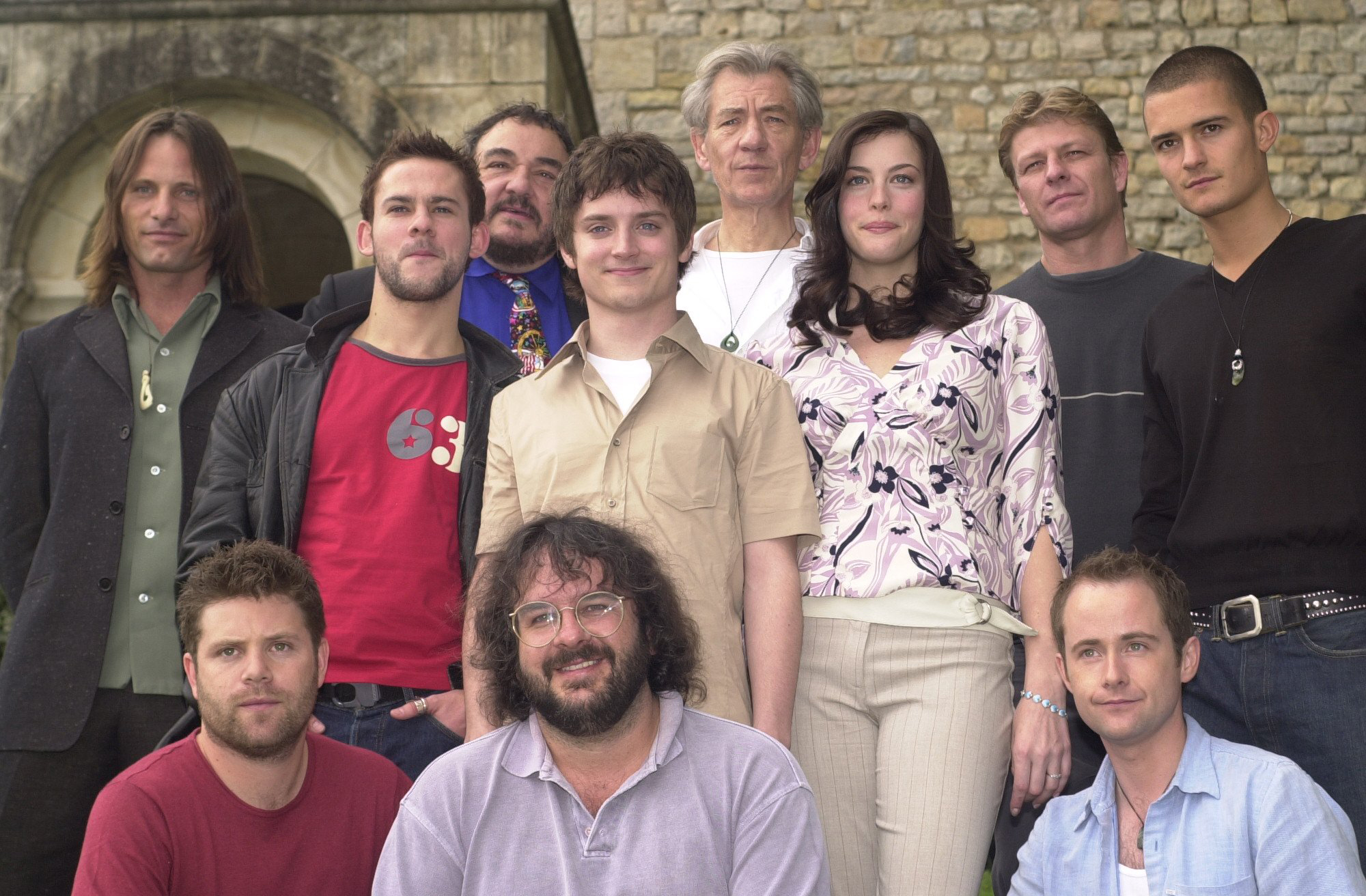 Description: A group of people posing for a picture together in front of a stone building with a doorway in the background.