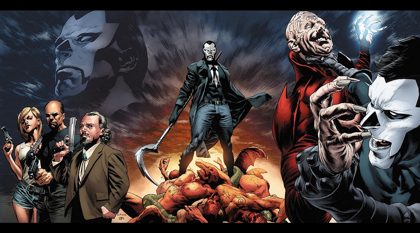 Description: A group of people standing around each other in front of a poster of a man with a knife and a demon.