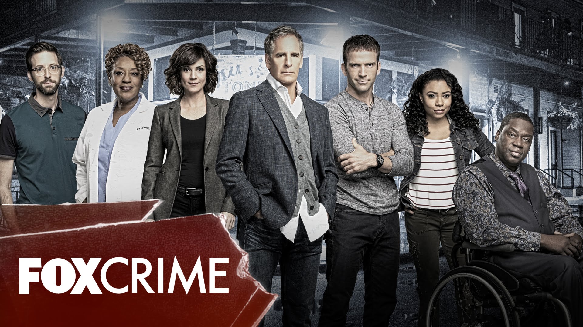Description: A group of people standing around a red box with the words fox crime on it and a man in a wheelchair.