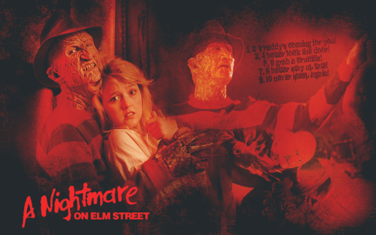 Description: A group of people in a room with a red light on them and a sign that says nightmares on them.