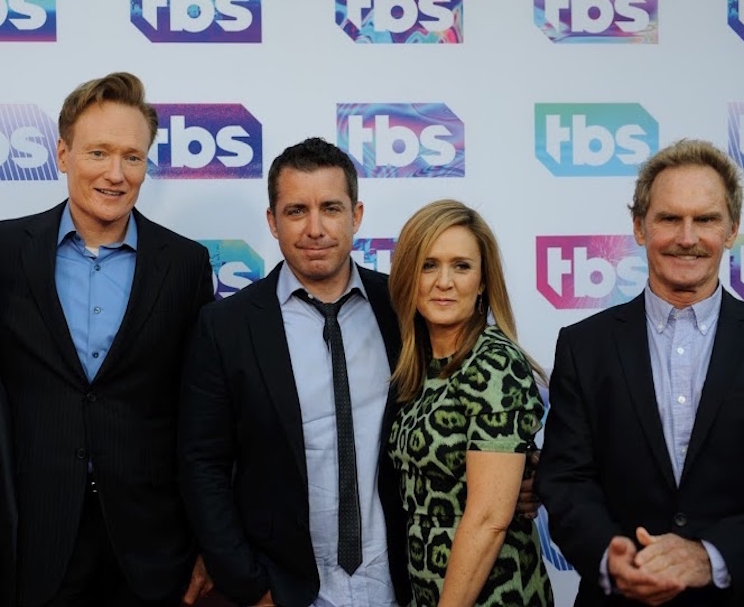 Description: A group of people standing next to each other on a red carpet with a tv logo behind them and a tv logo behind them.