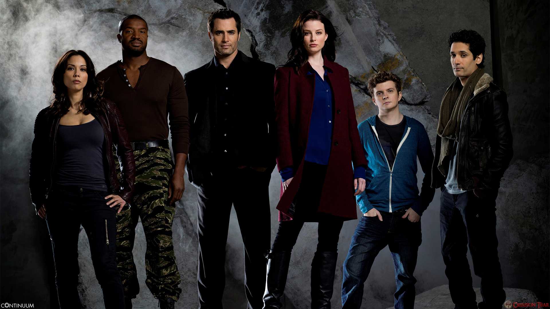 Description: A group of people standing next to each other in front of a rock wall with smoke behind them and a man in a blue shirt.