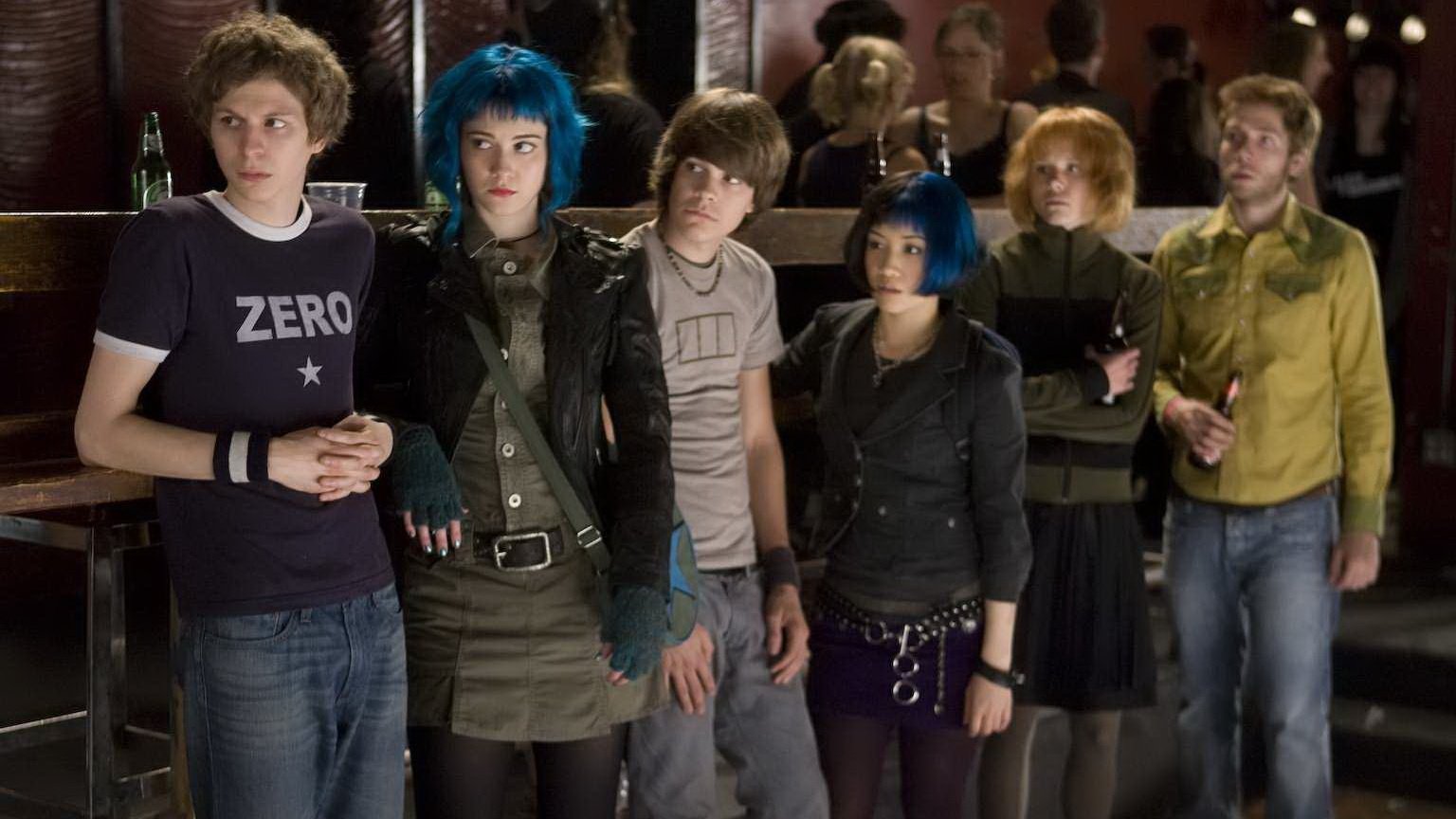 Description: A group of people standing next to each other in a room with a bar and a bar stools.