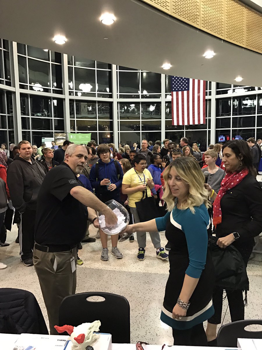 Description: A group of people standing around a room with a flag on the wall and a table with a cake on it.