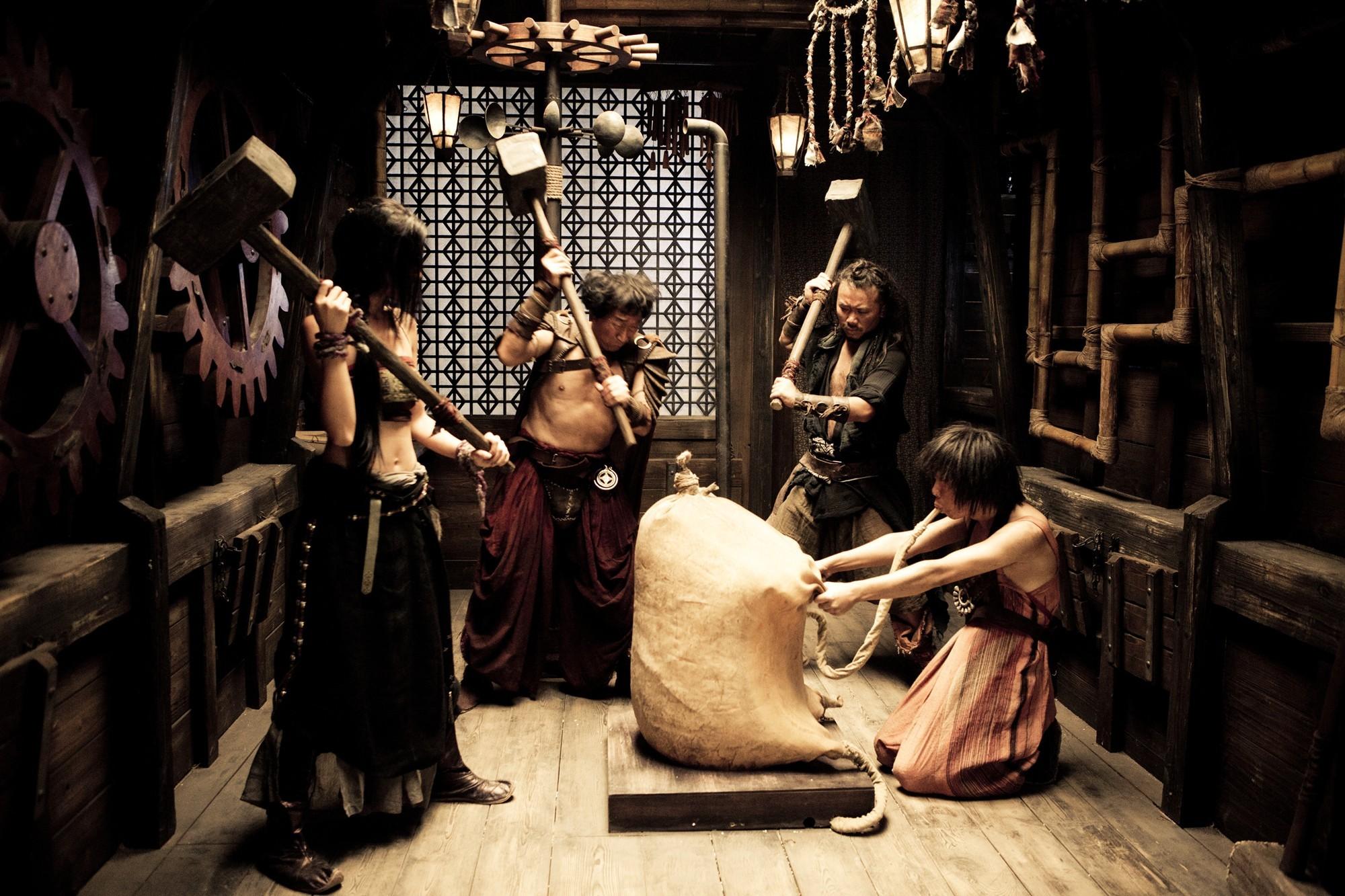 Description: A group of people in a room with a large animal on the floor and a woman in a dress.