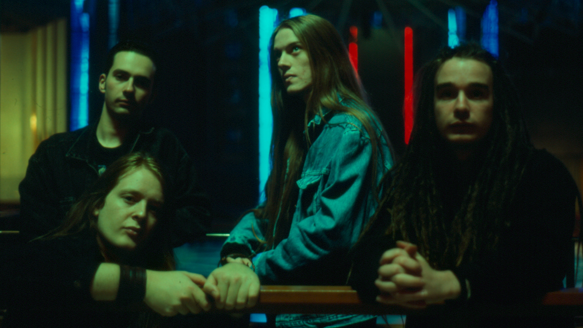 Description: A group of people standing next to each other in a room with lights on the walls and a table.