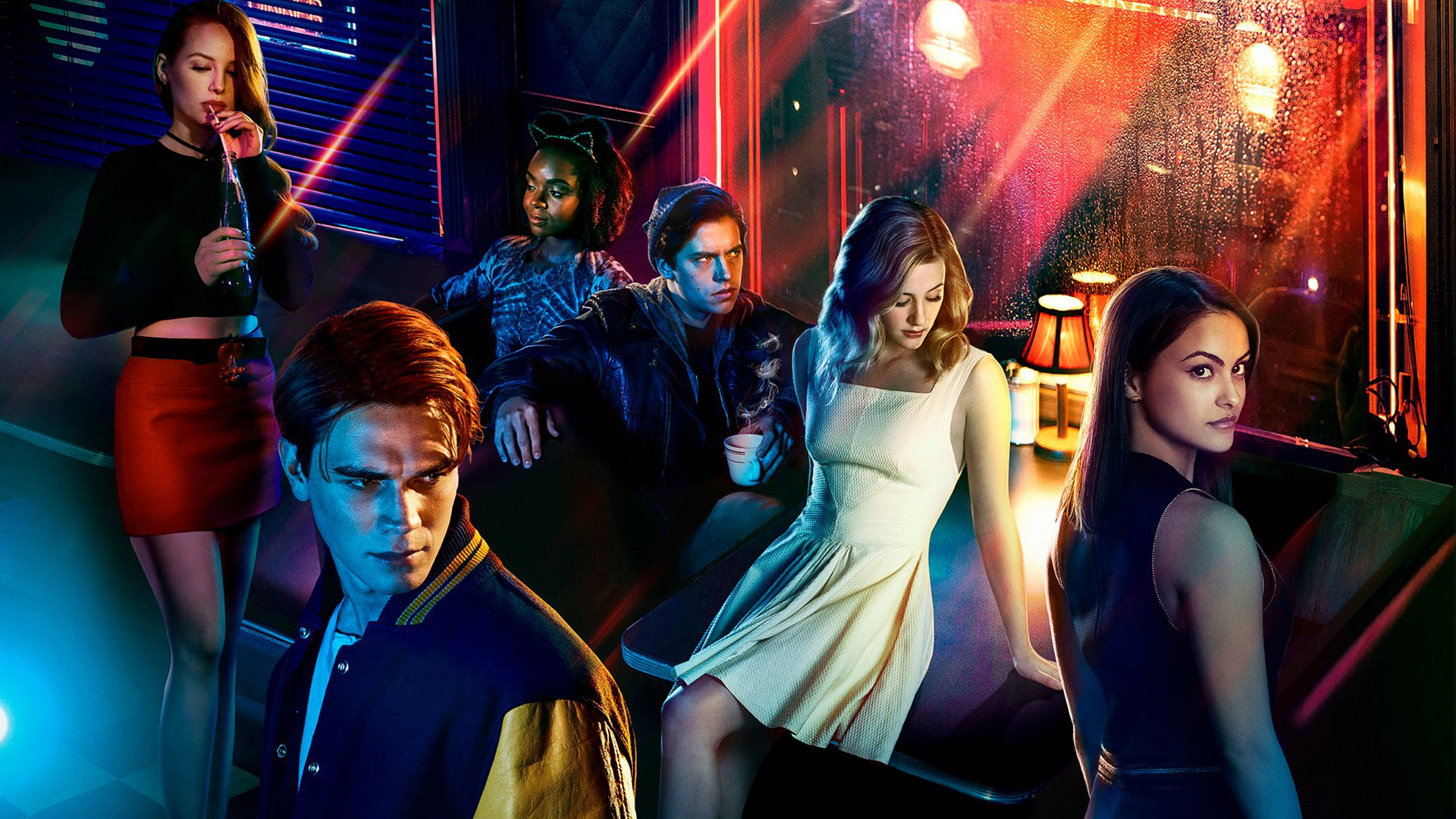 Description: A group of people standing around each other in a room with lights on the walls and a woman in a white dress.