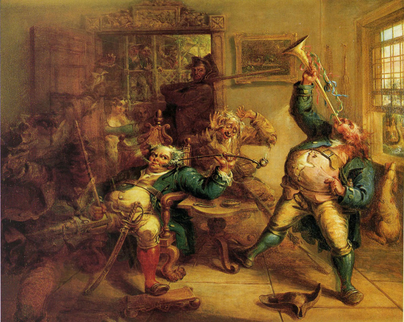 Description: A painting of a group of people in a room with a man holding a flag and a woman holding a flag.