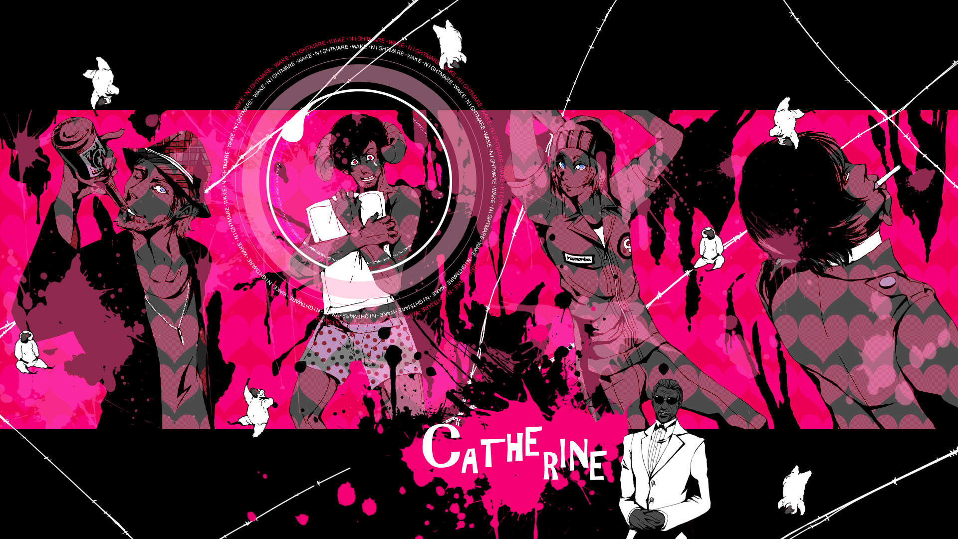 Description: A group of people standing around each other in a room with pink paint splatters on the walls.