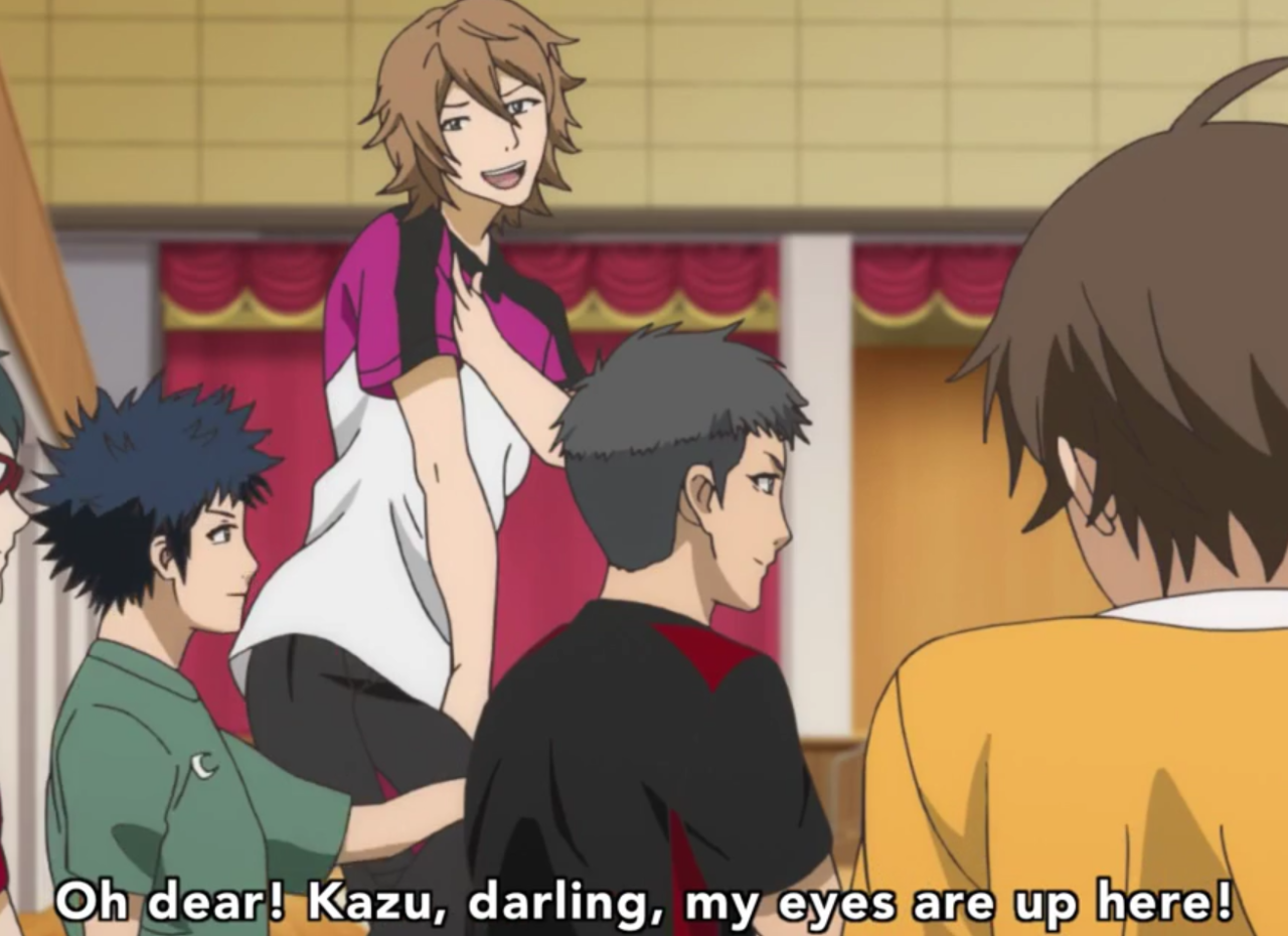 Description: A group of people standing around each other in a room with a sign that says oh dear kau.